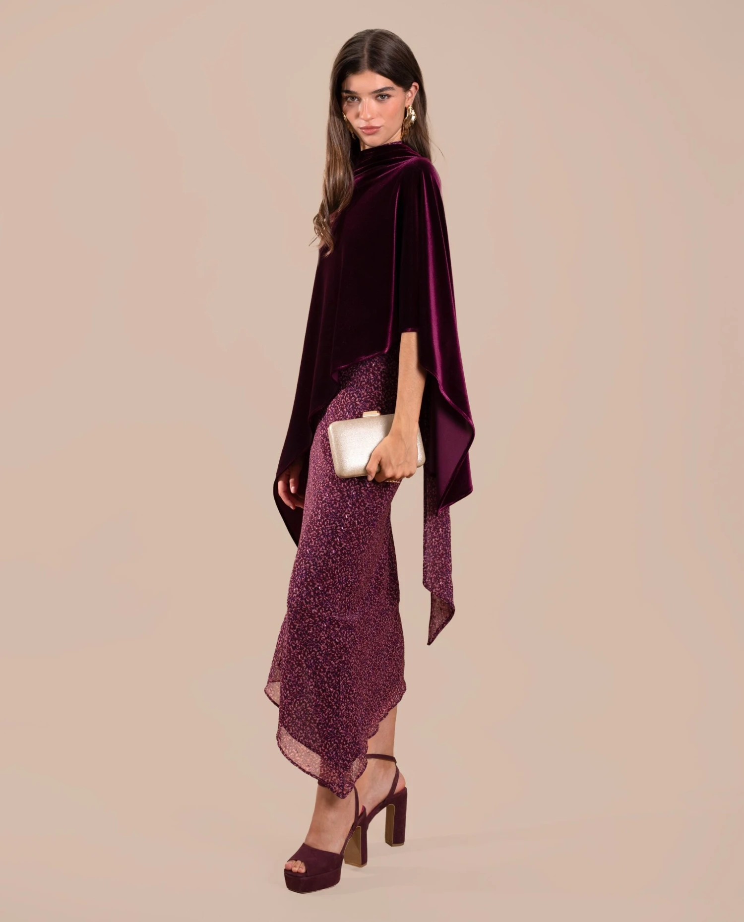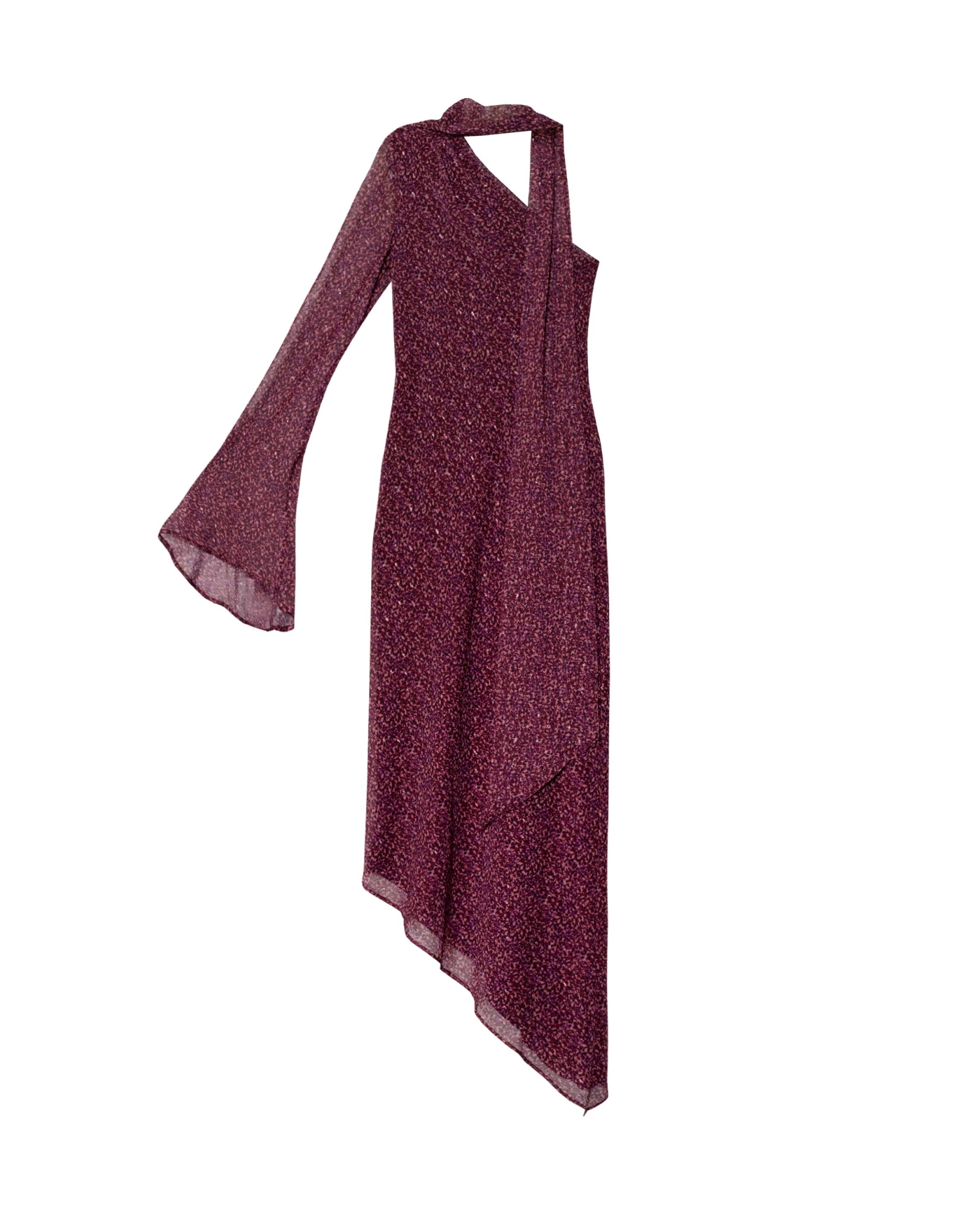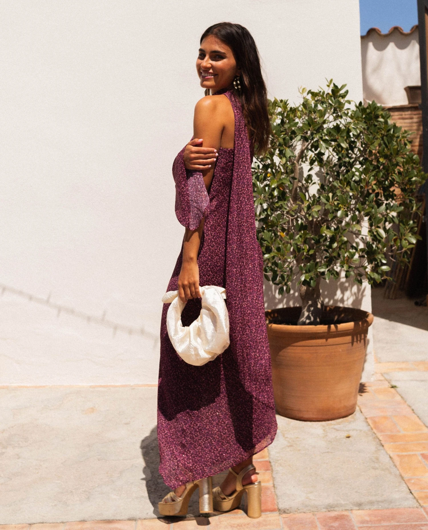 Vestido midi estampado asimétrico con lazada.[readmore]El vestido Chloé es ideal para la invitada que busca un vestido elegante y sofisticado que atraiga todas las miradas. Diseñado para hacerte sentir espectacular, está confeccionado en un tejido de gasa estampado que combina tonos morados con delicados toques de brillo. Su escote asimétrico drapeado y el cuello alto con una sofisticada lazada harán que tu look hable por sí solo, convirtiéndote en la invitada perfecta. Cortado al bies para una caída preciosa y movimiento fluido. Con accesorios dorados, el look perfecto está asegurado.