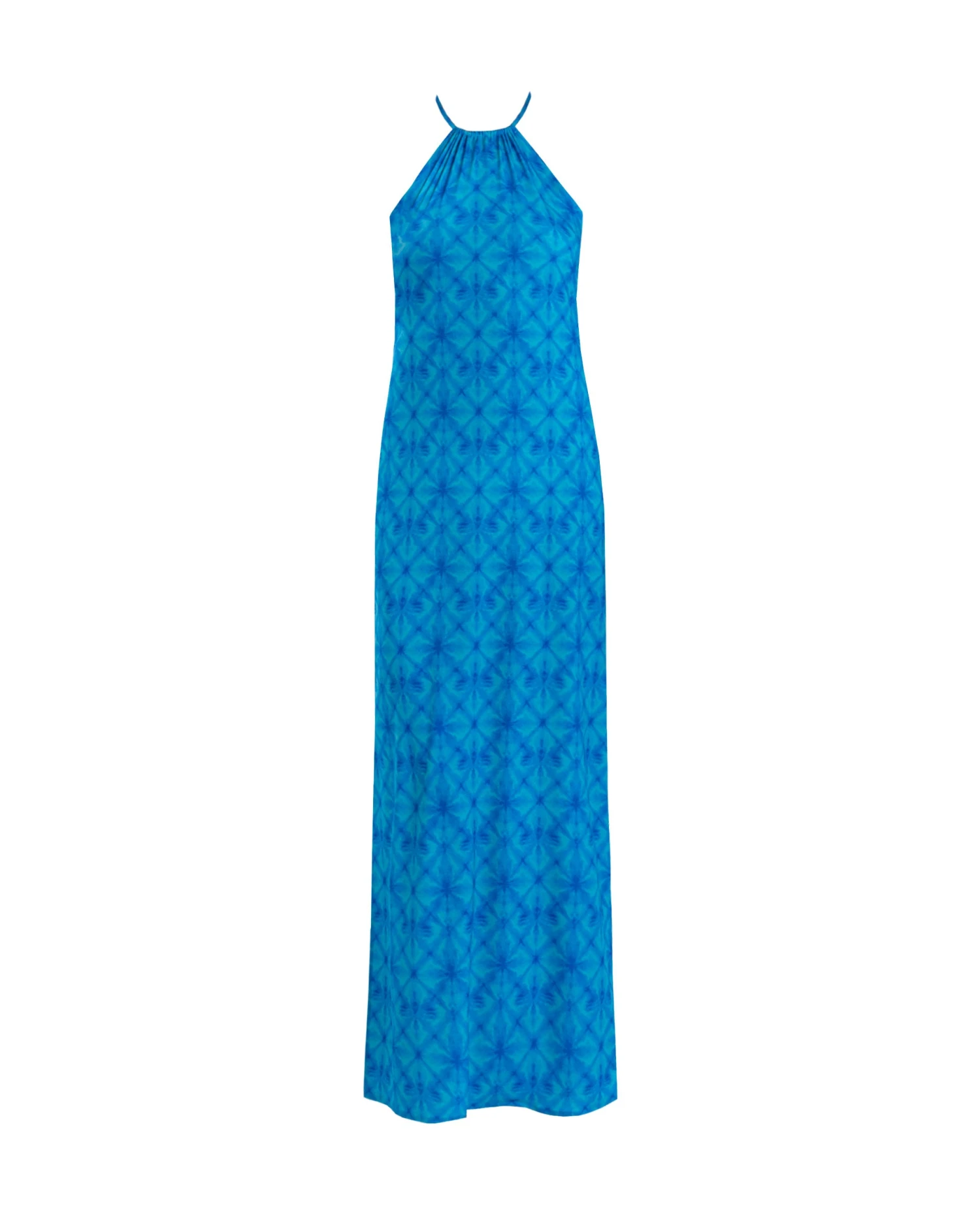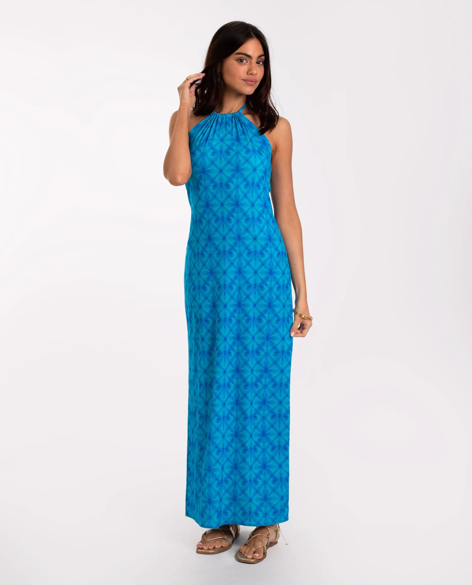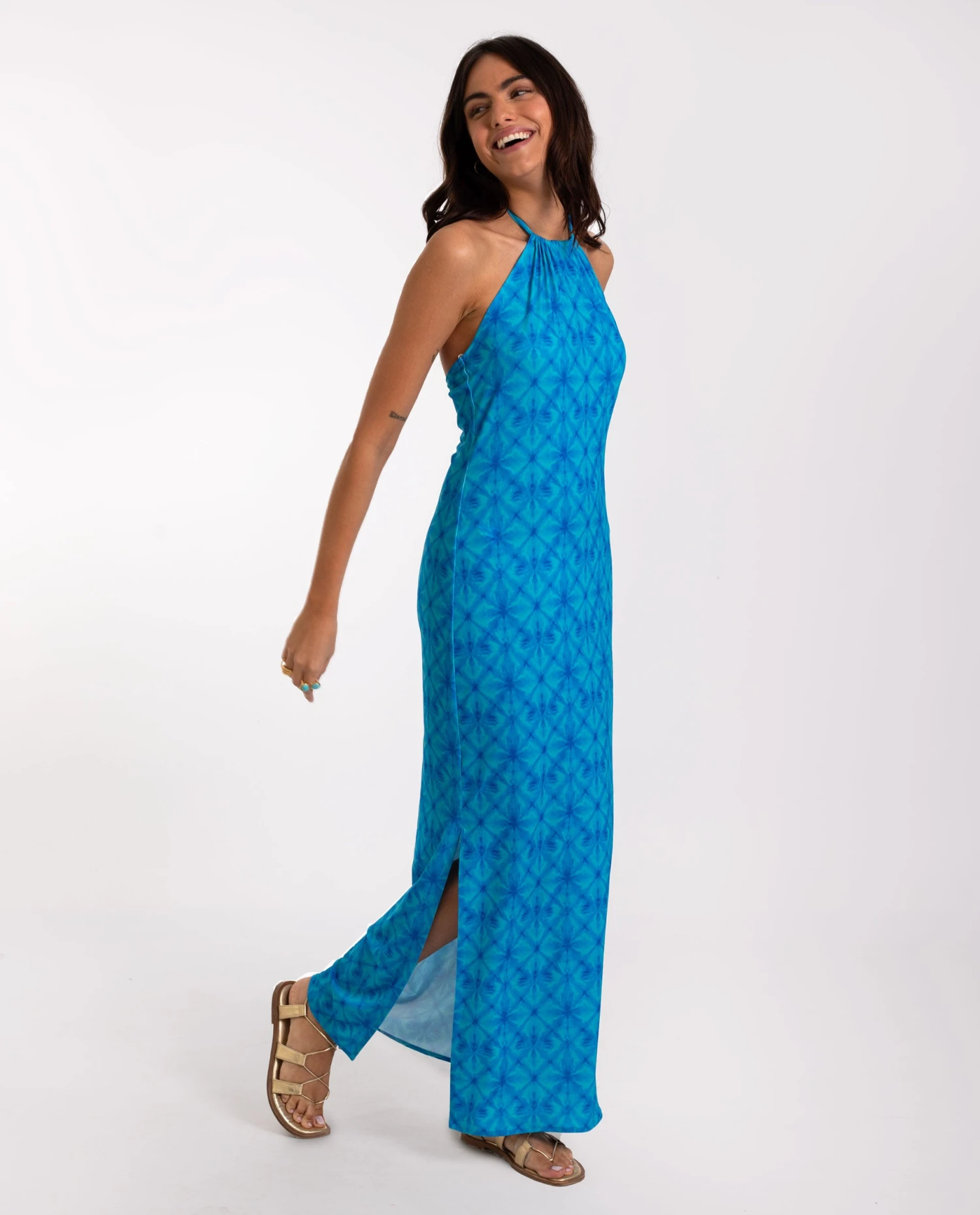 Vestido midi de punto azul con escote halter.[readmore]Must for summer!🌴 Hemos diseñado el vestido que vas a ponerte en tus planes de este verano. Es un vestido confeccionado con un tejido de punto azul muy ligero, elástico y cómodo, con la espalda al descubierto. Es de escote halter y gracias a la lazada al cuello lo puedes llevar de dos formas diferentes. Póntelo con cuñas, sandalias planas o zapatillas, queda bien con todo!