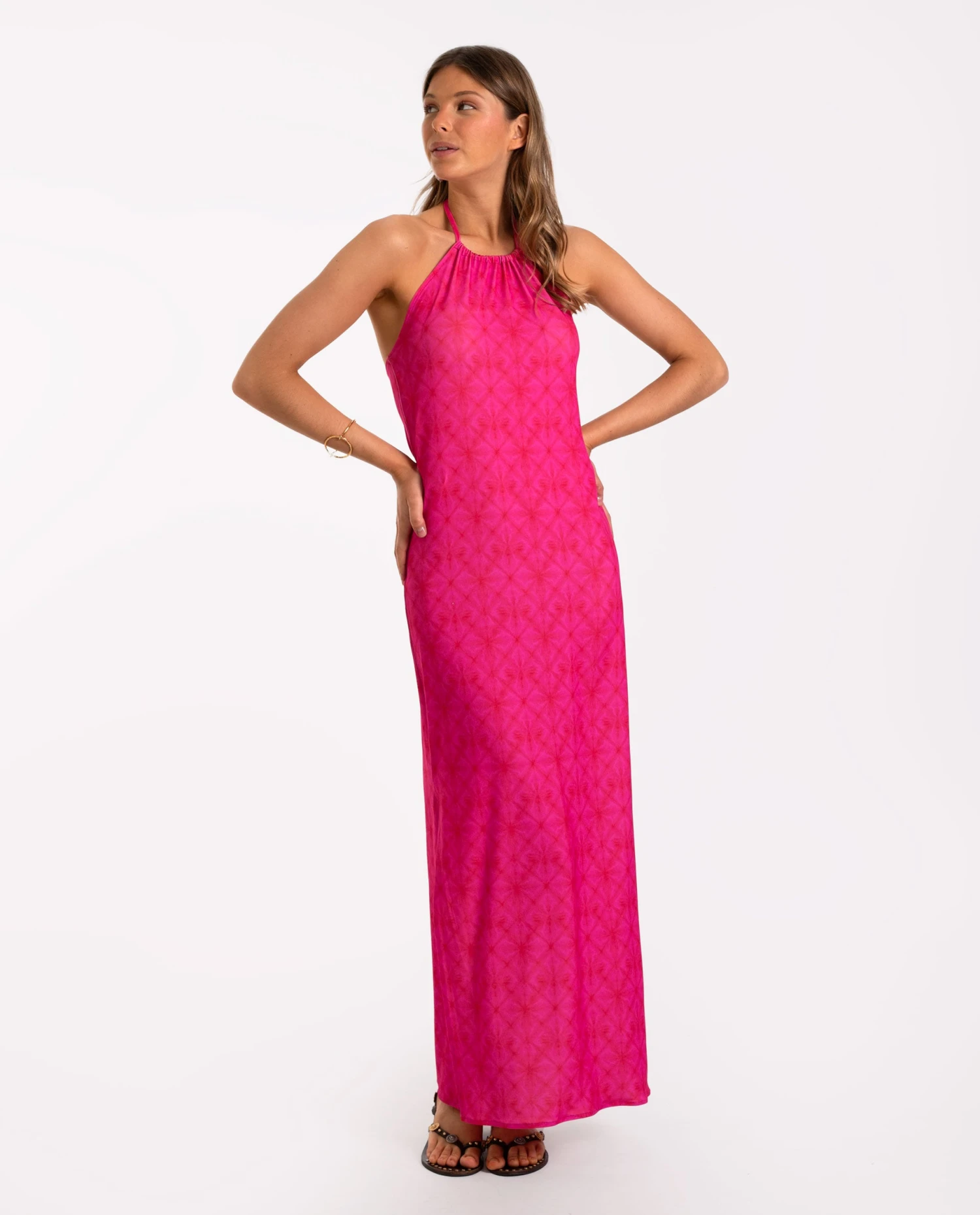 Vestido midi de punto rosa con escote halter.[readmore]Must for summer!🌴 Hemos diseñado el vestido que vas a ponerte en tus planes de este verano. Es un vestido confeccionado con un tejido de punto azul muy ligero, elástico y cómodo, con la espalda al descubierto. Es de escote halter y gracias a la lazada al cuello lo puedes llevar de dos formas diferentes. Póntelo con cuñas, sandalias planas o zapatillas, queda bien con todo!