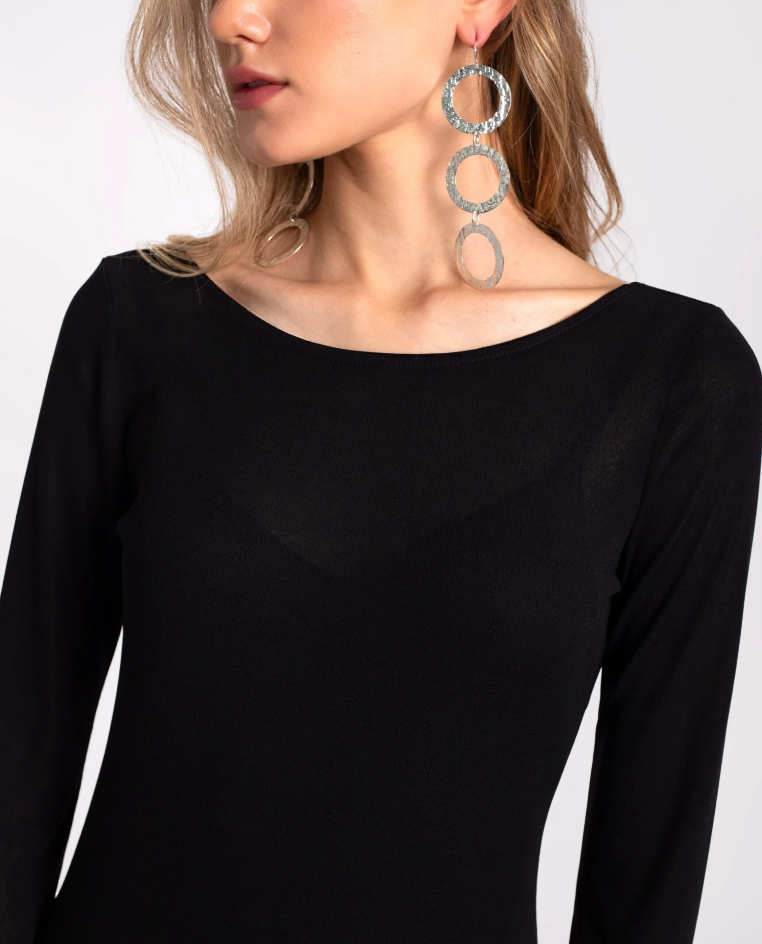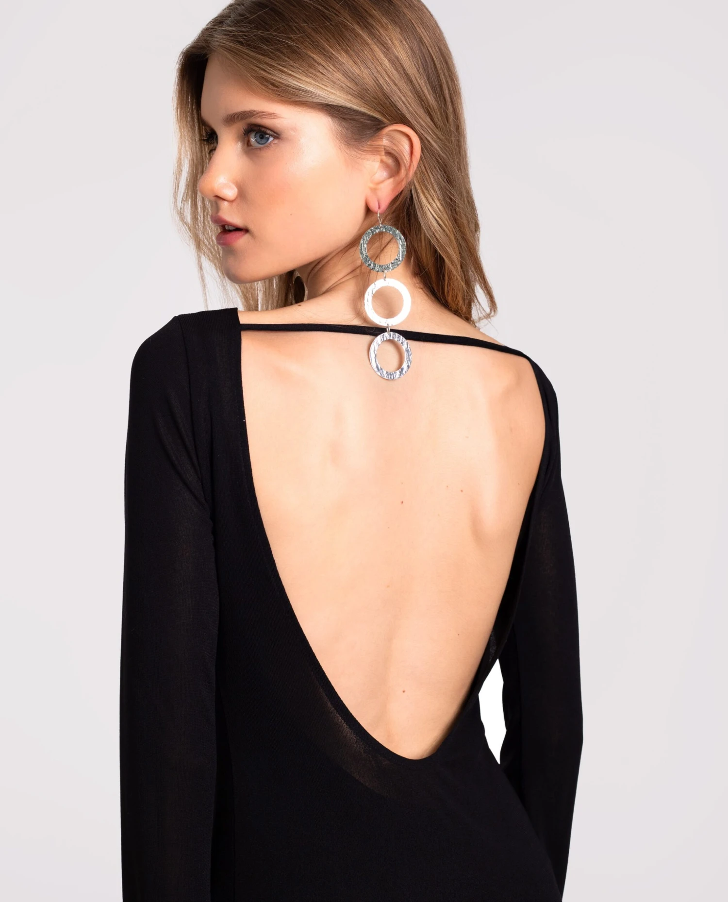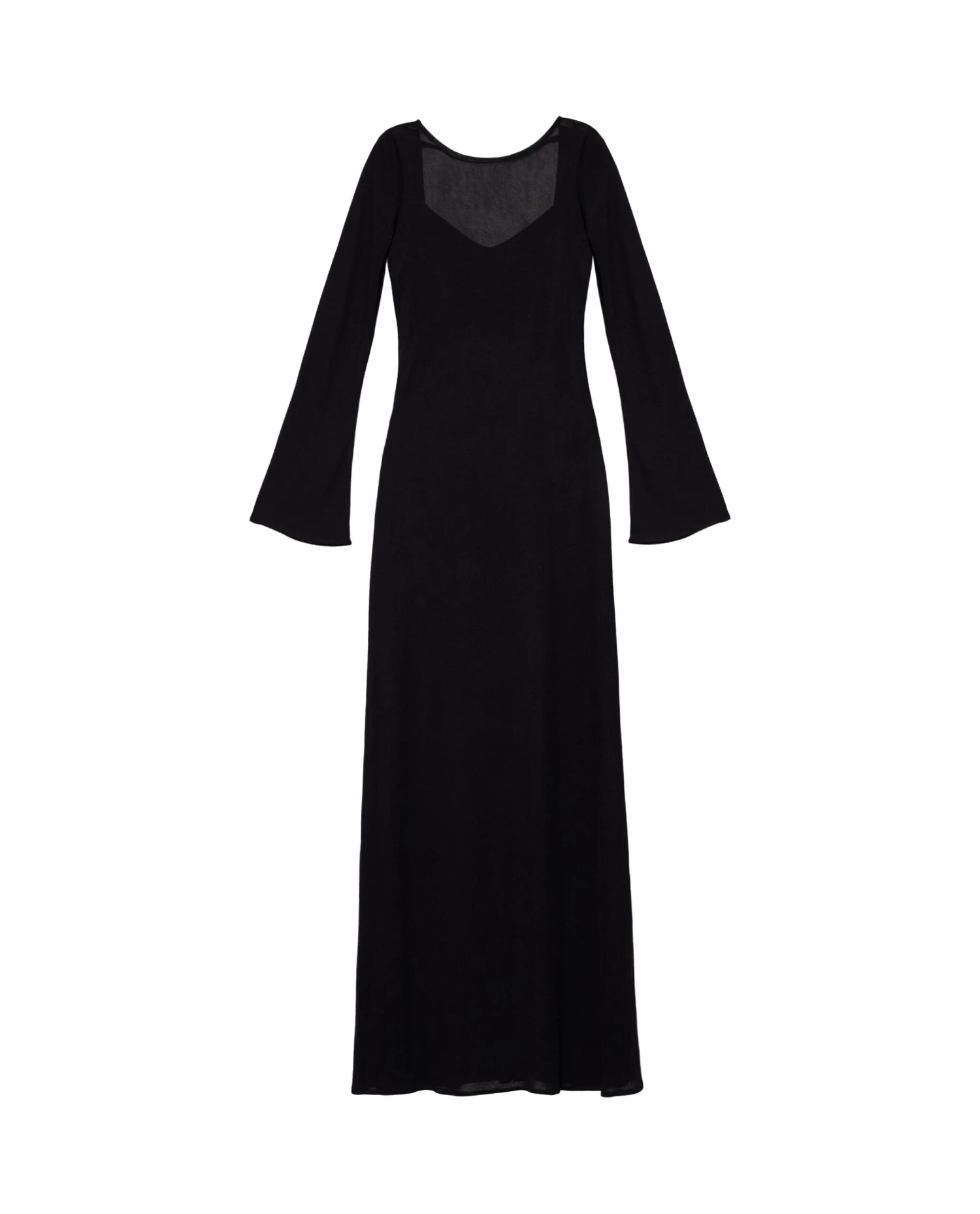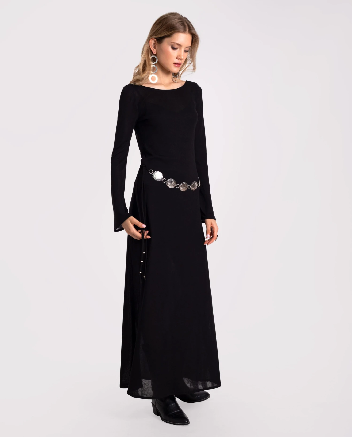 Vestido de punto largo negro con espalda abierta.[readmore]Este vestido es uno de nuestros favoritos de la colección por su versatilidad, ideal tanto para el día a día como para ocasiones especiales. Confeccionado en un punto suave y agradable al tacto, destaca por su escote pronunciado en la espalda. Es ligeramente transparente, por esto hemos incluido un mini vestido de tirantes como forro. Su caída es espectacular, y su diseño ajustado en la parte superior con vuelo en la falda y mangas ligeramente acampanadas lo hacen súper favorecedor. Puedes llevarlo de forma sencilla o elevarlo con los complementos perfectos.