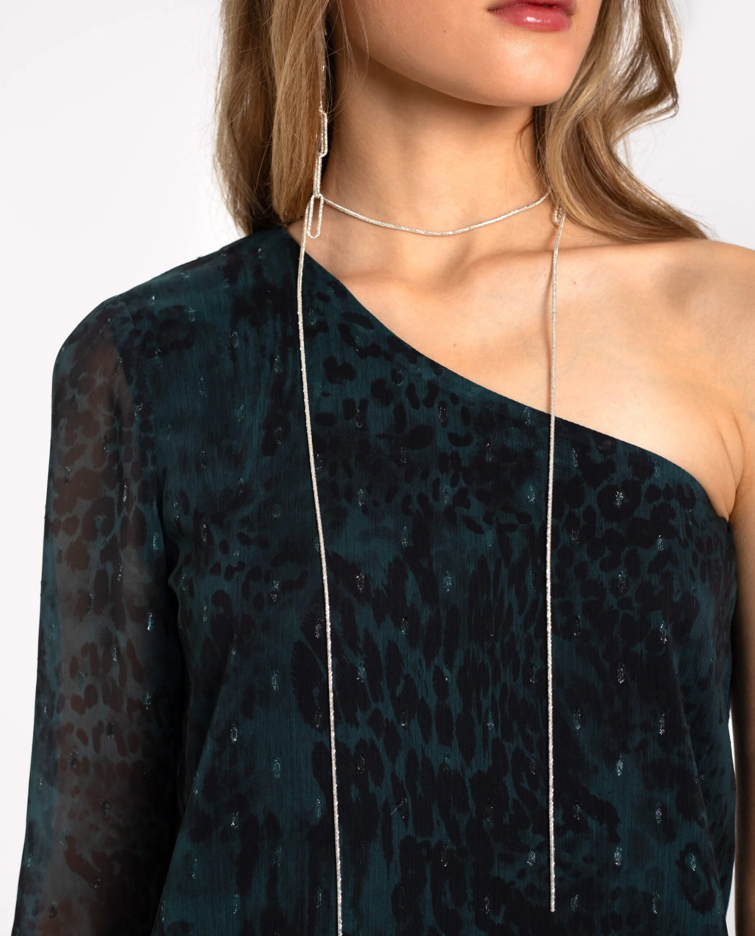 Vestido mini escote asimétrico con estampado.[readmore]Este vestido es ideal para cualquier ocasión gracias a su diseño. Su escote asimétrico y corte evasé es muy favorecedor, mientras que la manga larga acampanada añade movimiento al look. El estampado animal print, creado en tonos verdes y con hilos de lúrex, aporta un brillo sutil que hace que este vestido sea muy versátil y perfecto para llevar a diario y también en ocasiones especiales. ¡No dejarás de llevarlo!