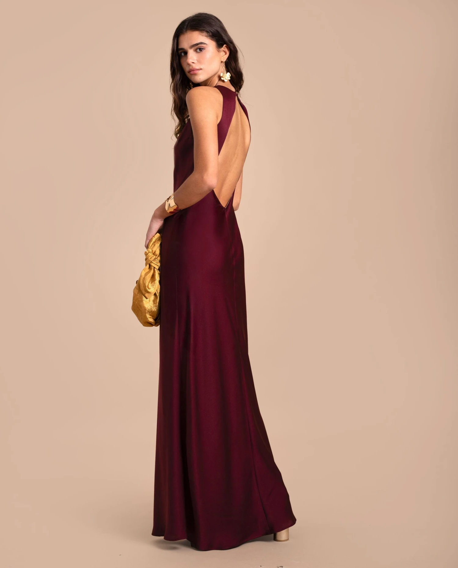 - Vestido largo burdeos con caída.
