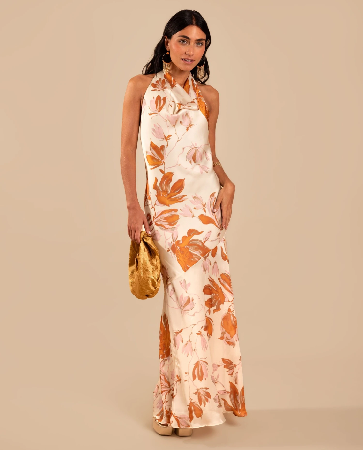 Vestido largo con estampado floral con escote halter drapeado.[readmore]Un diseño que lo tiene todo: fluidez, movimiento y un estampado que no pasa desapercibido. Su escote halter drapeado estiliza el cuello y le da un toque de estilo elegante, mientras que el diseño fluido junto al estampado floral, crean un efecto chic súper especial. Además, este tejido tiene un ajuste perfecto y realza cualquier figura. Cuenta con forro de gasa interior. Prueba a combinarlo con alguna de nuestras joyas para conseguir el look ideal.