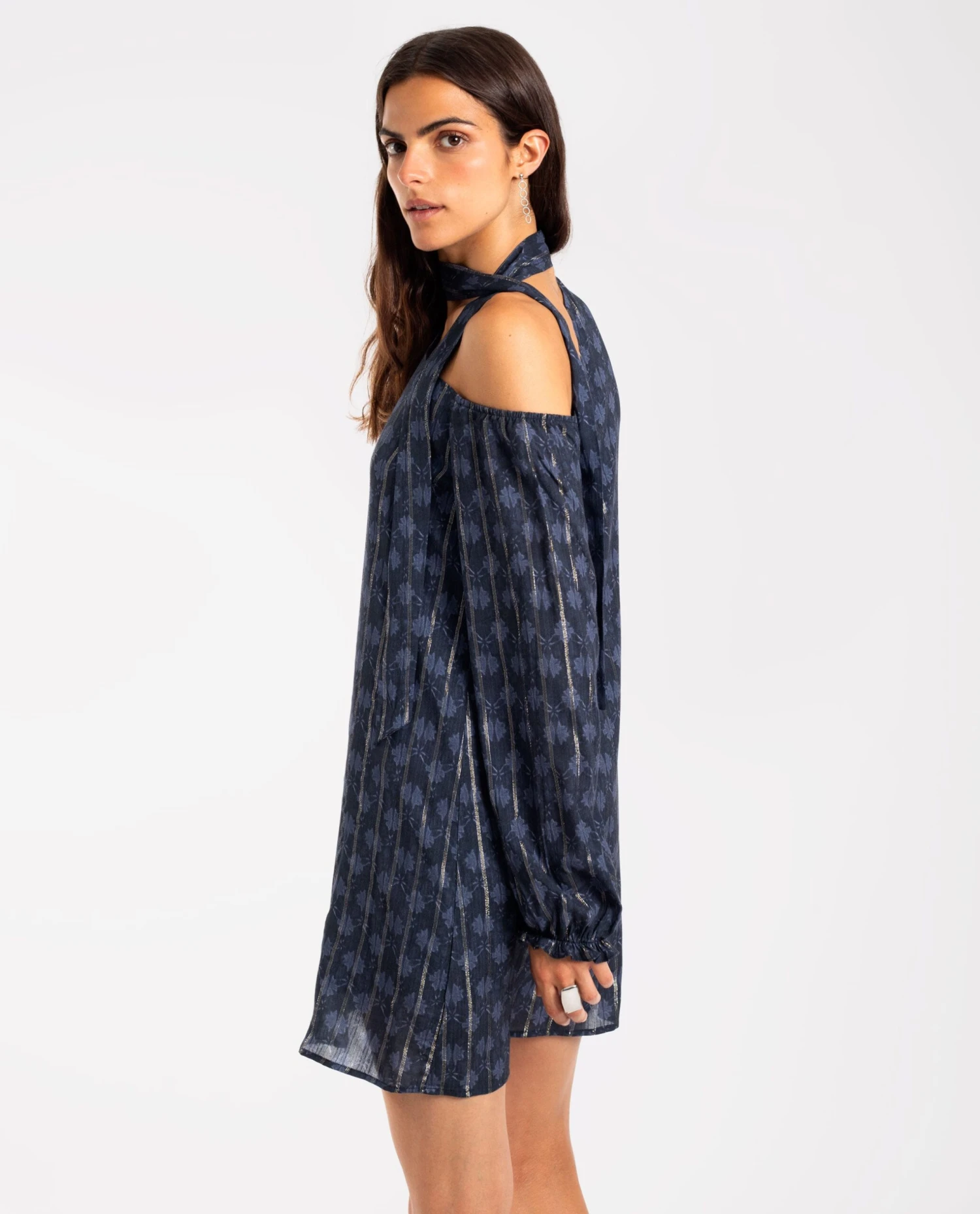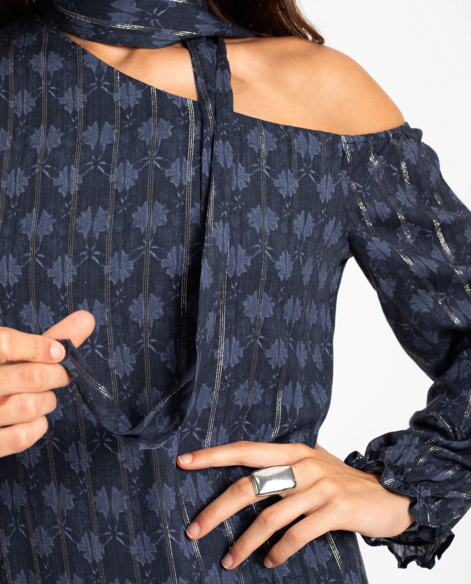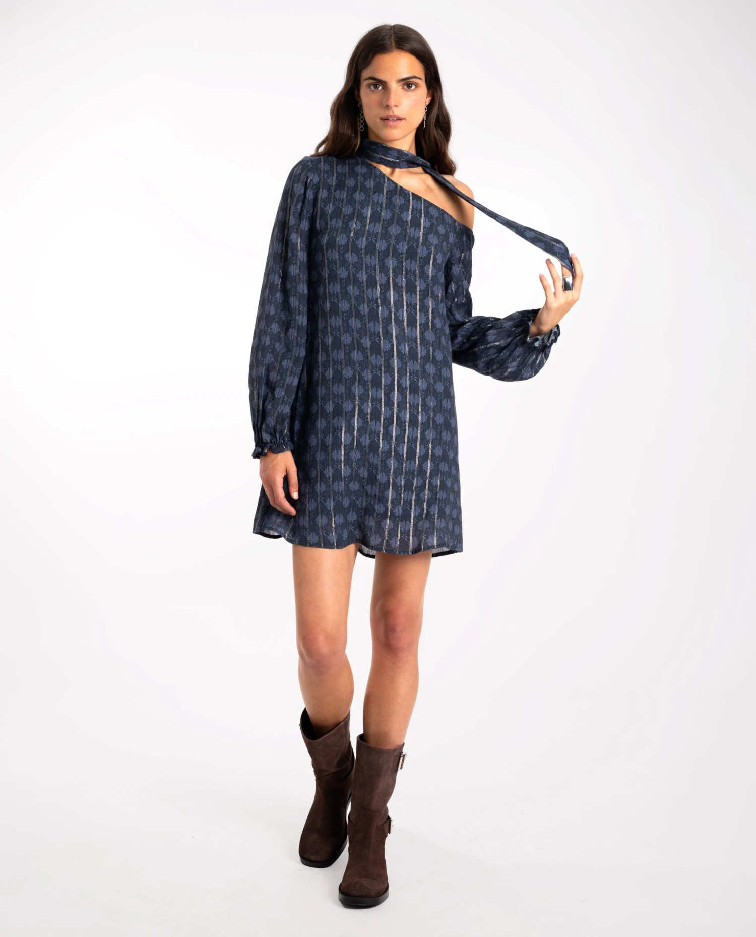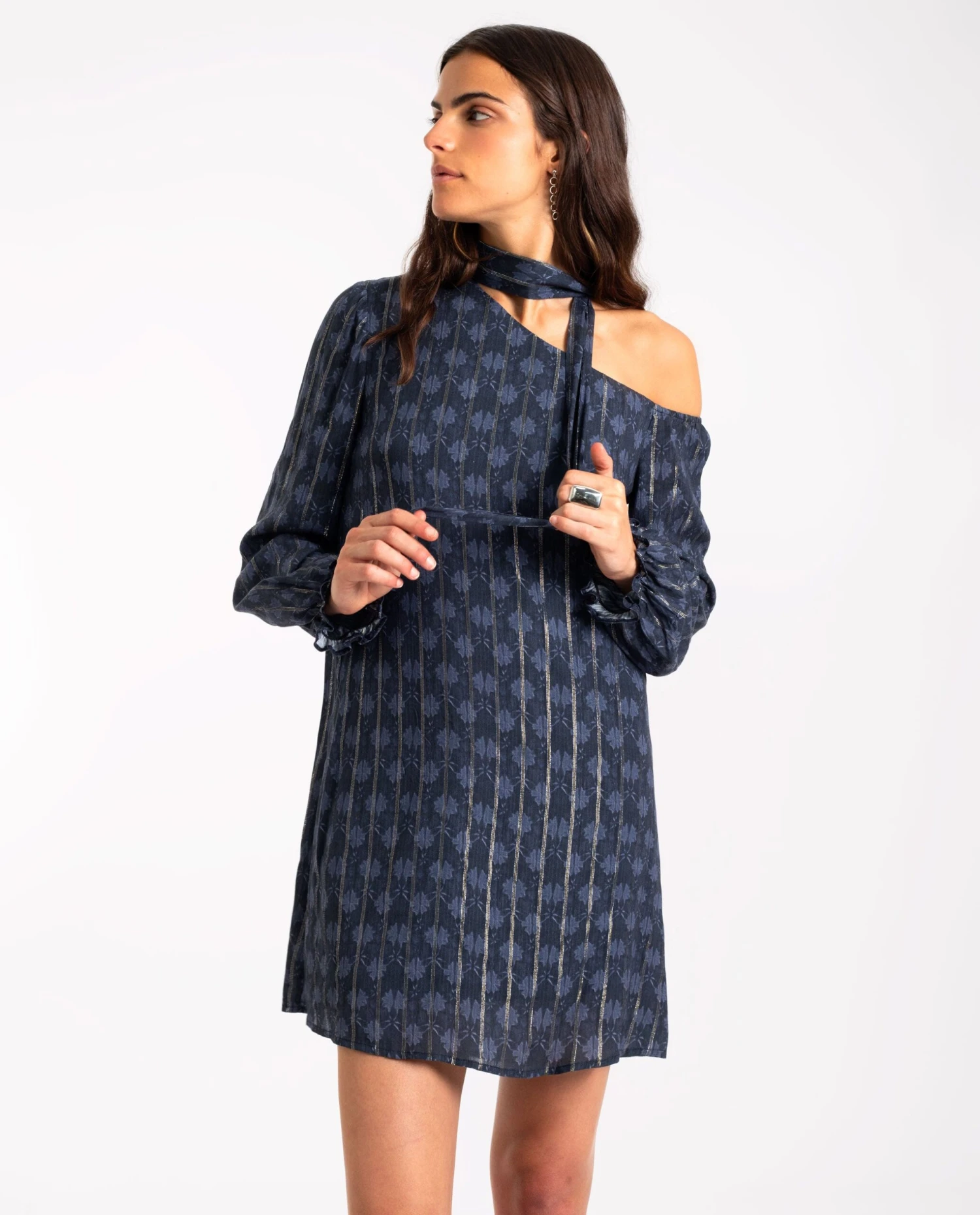 Vestido corto asimétrico con fular.[readmore]Estamos seguras de que este vestido se convertirá en tu favorito porque lo puedes llevar en cualquier ocasión! Está confeccionado en un tejido especial con tonos azul marino combinado hilos metalizados que añaden brillo al look. Tiene un escote asimétrico que deja un hombro un descubierto y mangas largas con puños elásticos. Además, incluye una lazada al cuello que le da un toque extra de estilo.