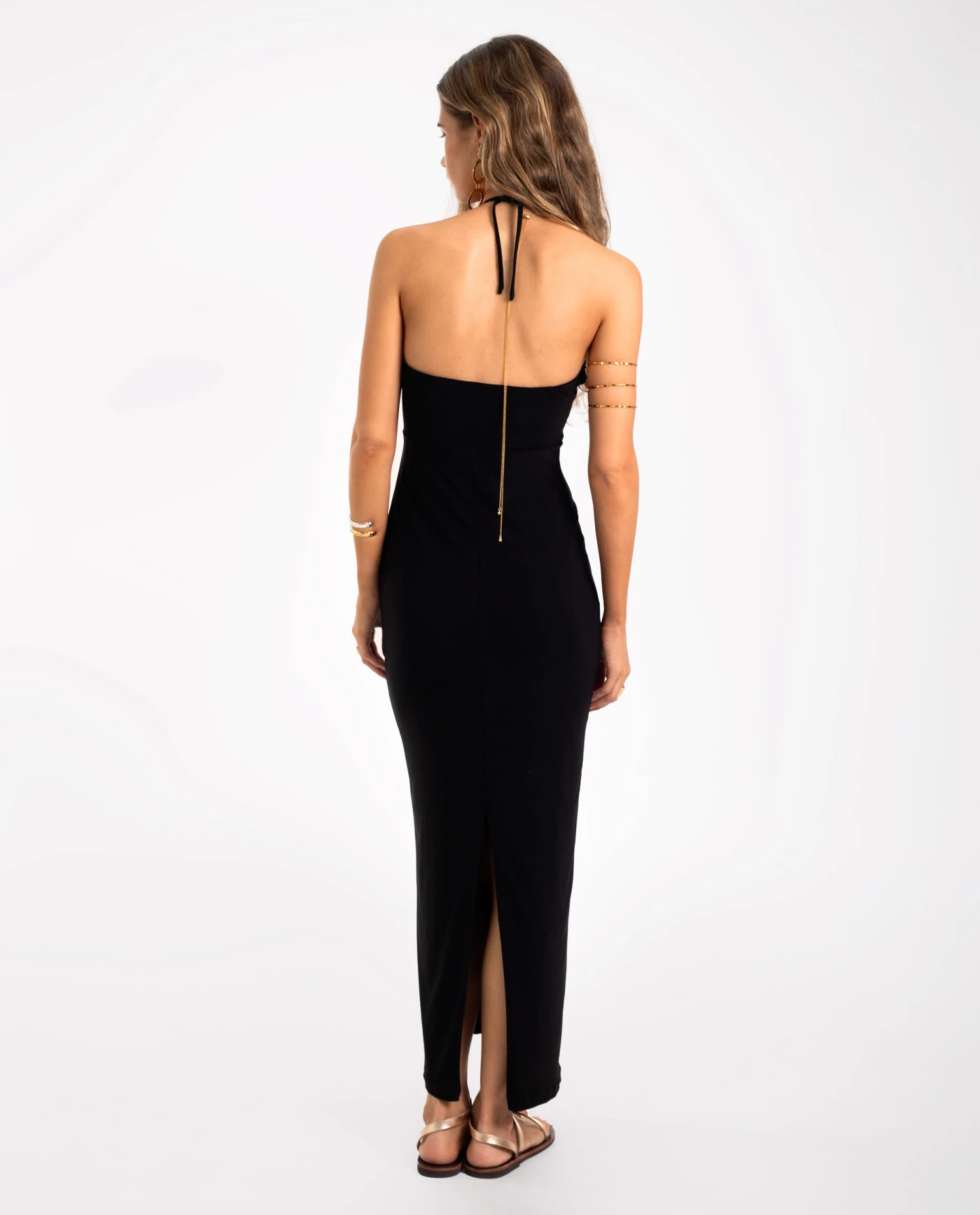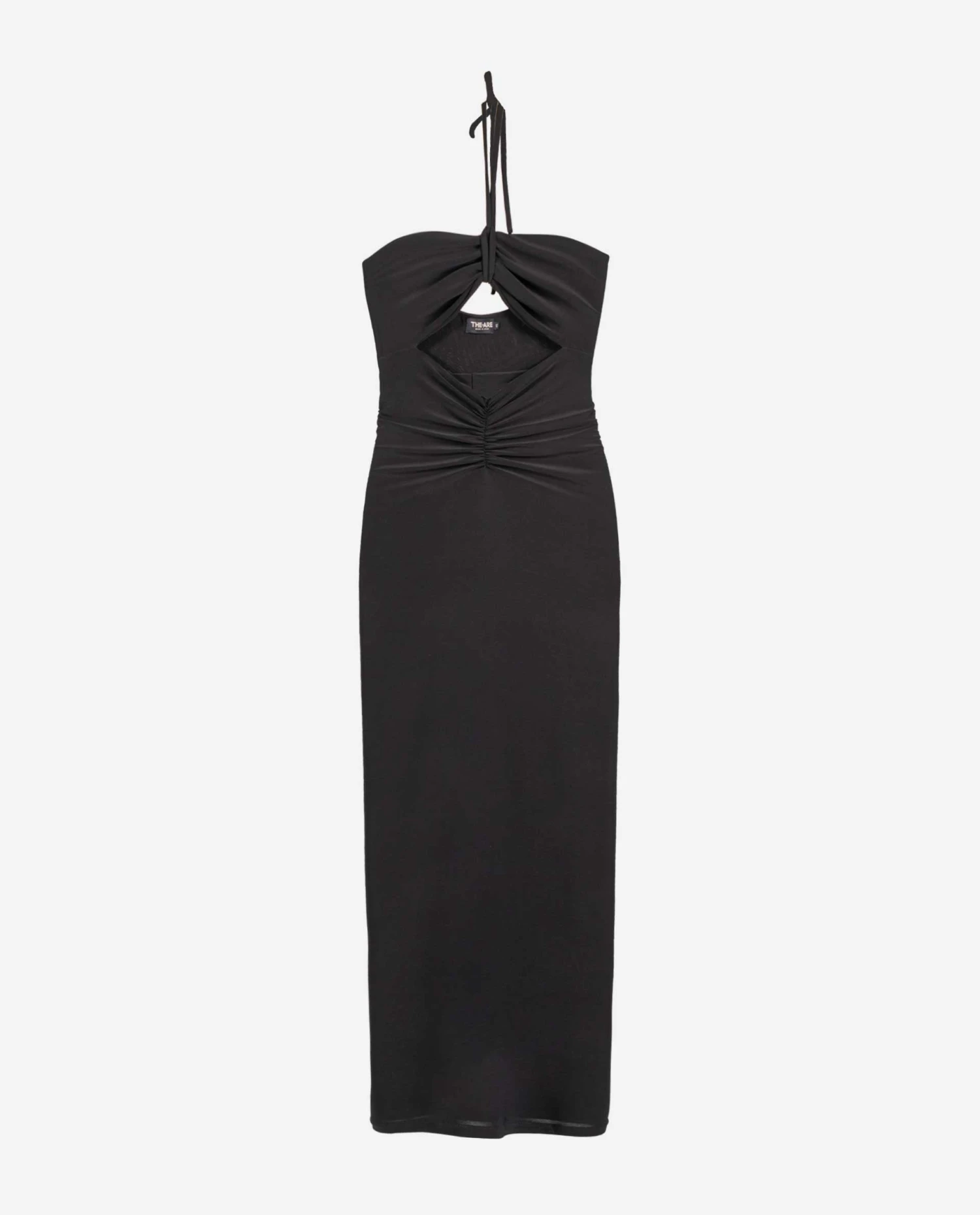 Vestido midi negro cut out multiposición con drapeado.[readmore]Uno de los vestidos más increíbles de esta colección!🤞🏼 Es atrevido a la vez que elegante y gracias a su diseño y tejido elástico sentirás que se acopla perfectamente a ti. Nuestra diseñadora ha pensado en cada detalle para que sea el vestido del verano que mejor siente: escote de palabra de honor, cut out central con drapeado en la cintura para estilizar y abertura trasera en la falda. Es un vestido que puedes llevar hasta de 3 formas diferentes: pasando la lazada por el top y anudando al cuello, sin lazada para un efecto palabra de honor y con lazada al cuello sin pasarla por el top. Nos flipa para cualquier fiesta de verano tanto con sandalias planas como con cuñas.