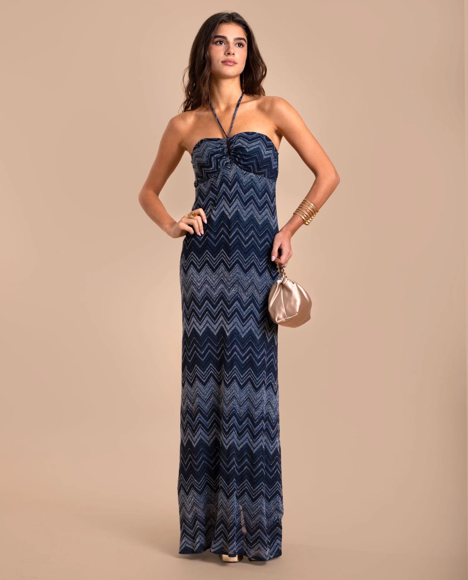 Vestido largo de punto con escote halter.[readmore]Un vestido que lo tiene todo para destacar en cualquier ocasión. Su tejido de punto elegante con diseño en zigzag y sutiles toques metálicos le da un aire especial, mientras que el escote halter y el corte imperio estilizan la silueta. La lazada ajustable te permite jugar con el escote, llevándola atada al cuello o suelta en forma de lazo. Además, va forrado para que te sientas cómoda y la abertura trasera en el bajo le da un extra de movimiento. Perfecto para combinar con accesorios en plata o dorado y arrasar en cualquier ocasión.