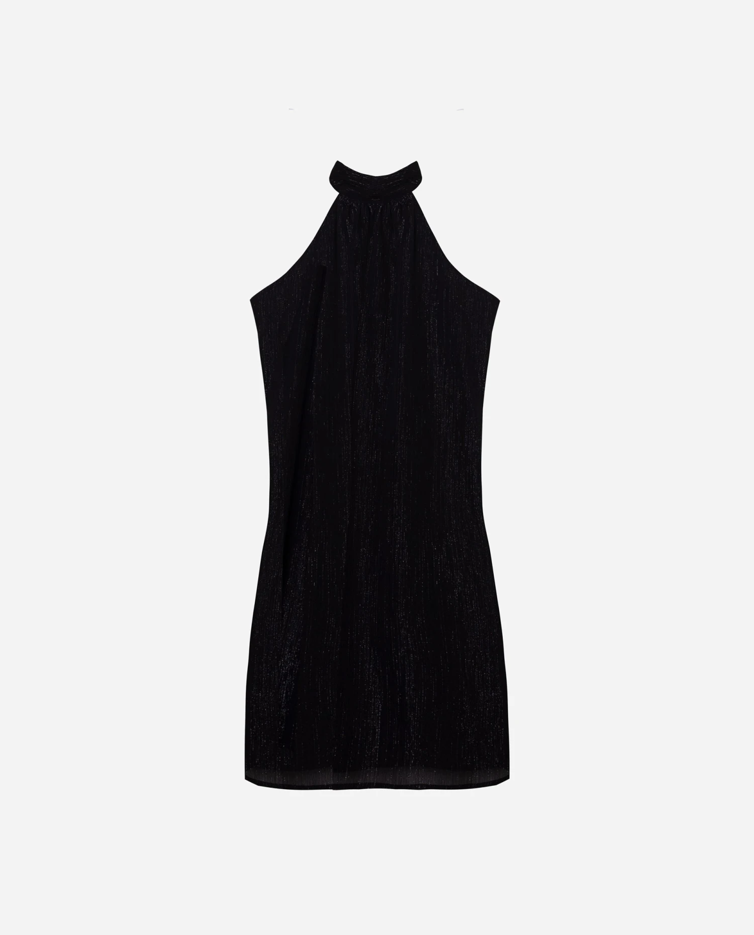 Vestido corto sin mangas negro con cuello halter.[readmore]Una de las piezas favoritas de esta colección. Su diseño sin mangas, cuello halter y espalda abierta (muy sexy) lo convierten en una opción perfecta para esos planes de tarde que se alargan hasta la noche. Su tejido con detalles de hilos de lúrex le aportan un brillo sutil que lo hace aún más especial. Además, su diseño fluido es muy favorecedor para todo tipo de cuerpos. ¡No dudes en probártelo y verás lo espectacular que sienta este vestido!