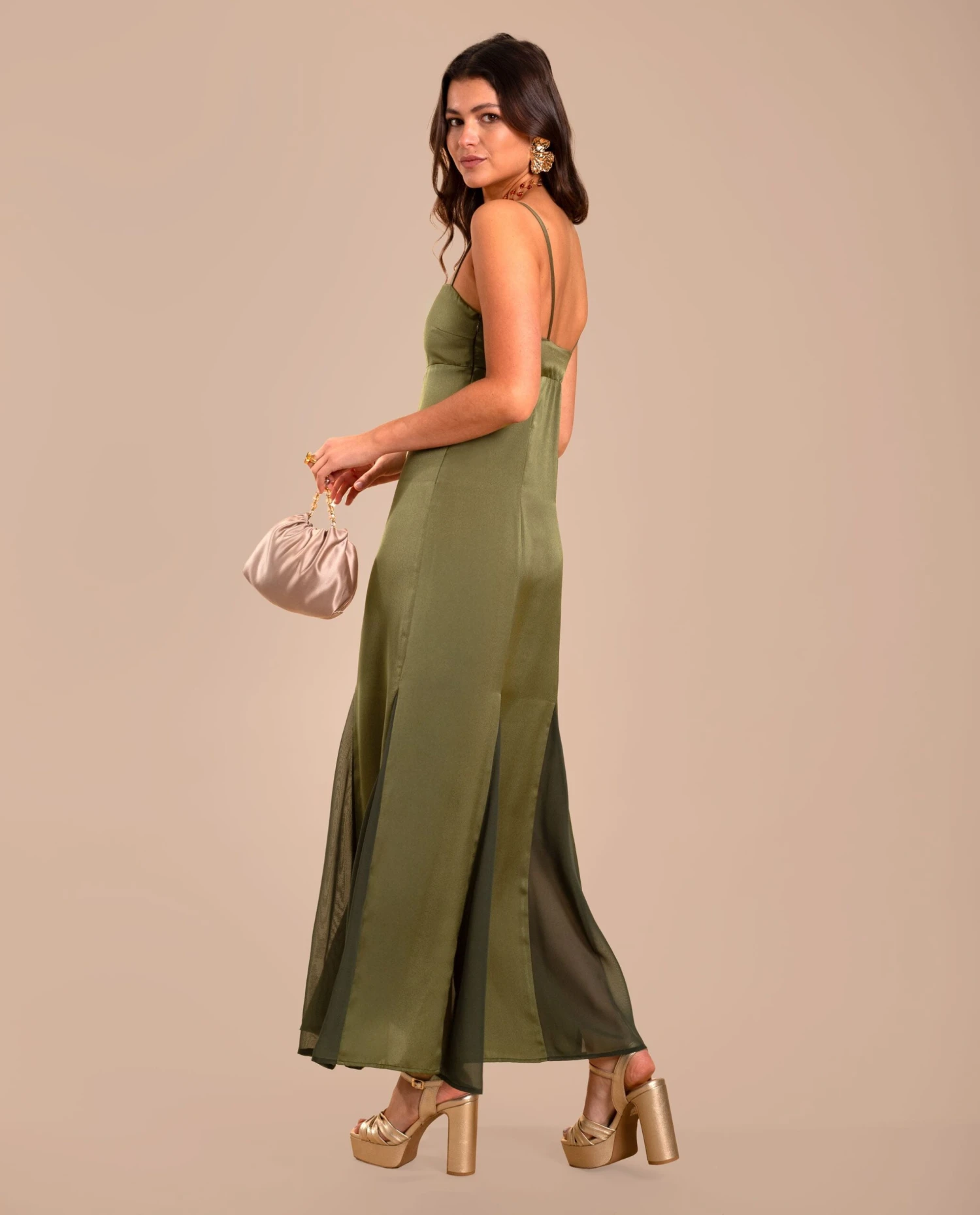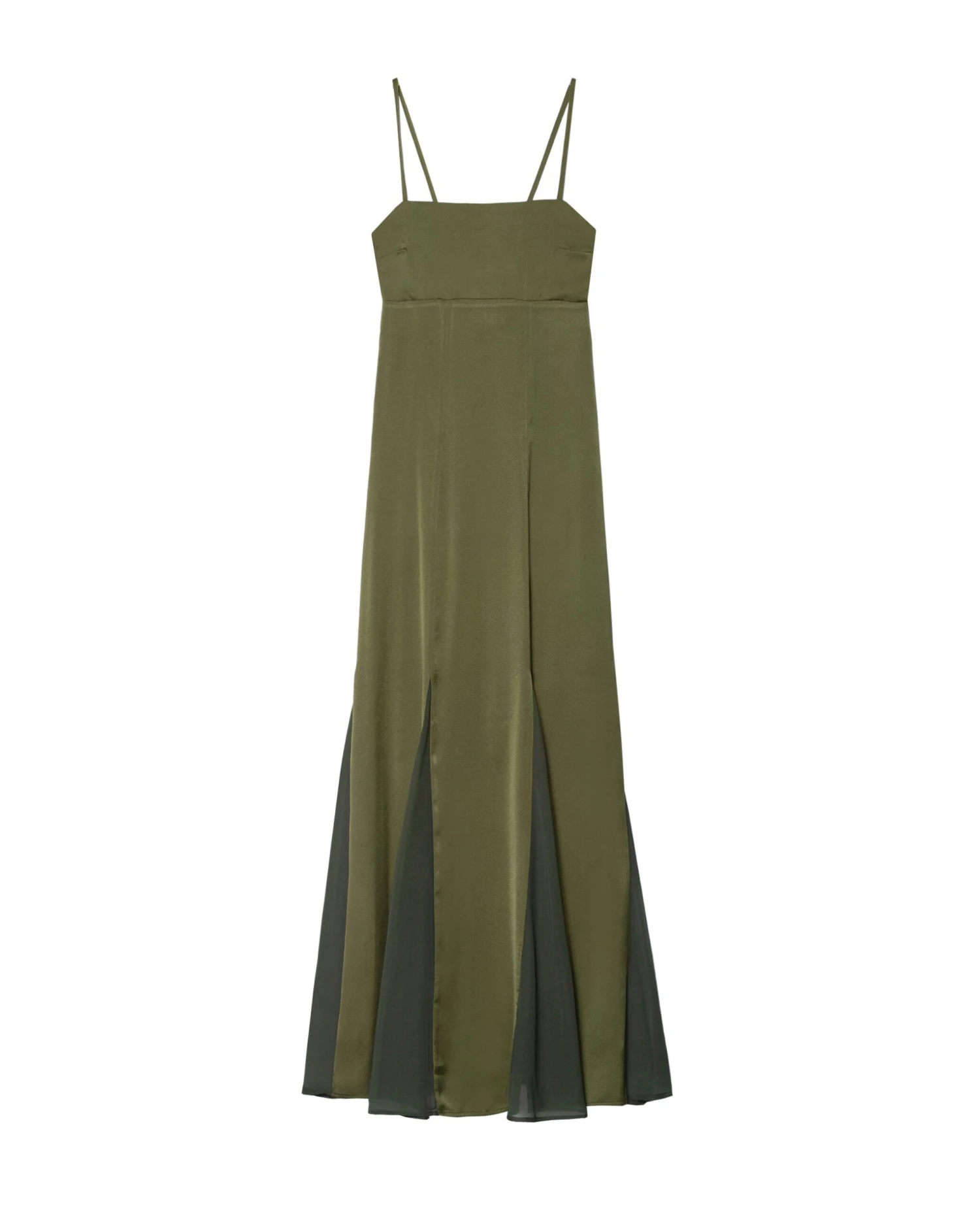 Vestido midi verde de corte imperio con tirantes.[readmore]Un diseño elegante pensado para acompañarte en los momentos más especiales. Su corte imperio estiliza la figura, mientras los tirantes finos y la falda evasé con paneles godet en contraste aportan un movimiento precioso al caminar. Confeccionado en un tejido fluido satinado combinado con gasa en la falda, su tono verde es una apuesta segura para triunfar en tu próximo evento. Completa el look con una de nuestras capas y accesorios dorados.