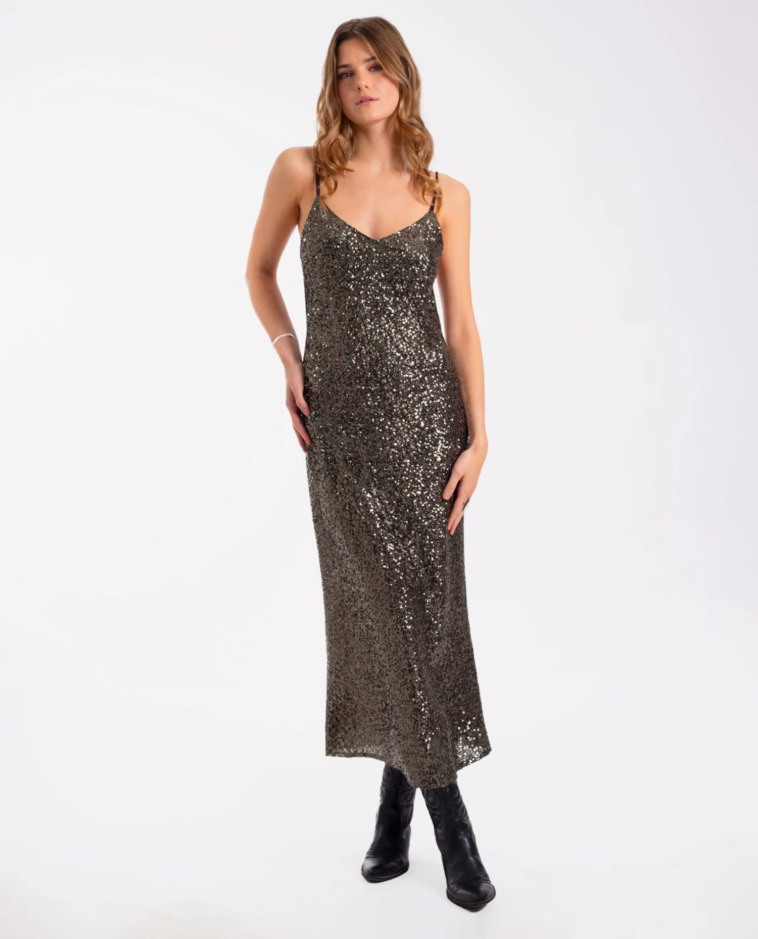 Vestido lencero de lentejuelas.[readmore]El vestido ideal para destacar en cualquier evento especial. Este diseño midi, completamente bordado con lentejuelas, tiene un favorecedor escote en pico tanto en el delantero como en la espalda, que queda completamente descubierta. Se adapta perfectamente a tu silueta gracias a su diseño fluido. Sus tirantes finos y ajustables añaden un toque delicado. Combínalo con una blazer negra y accesorios plateados para un look de fiesta que no pasará desapercibido.