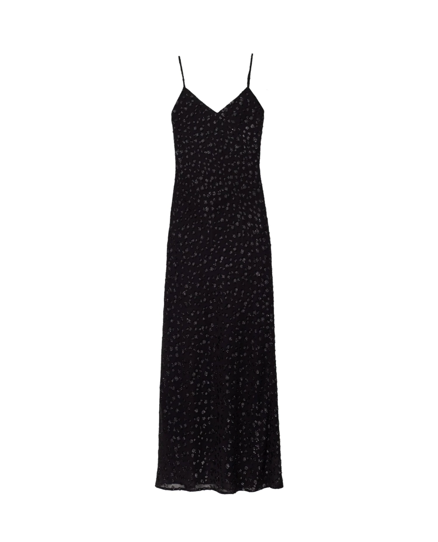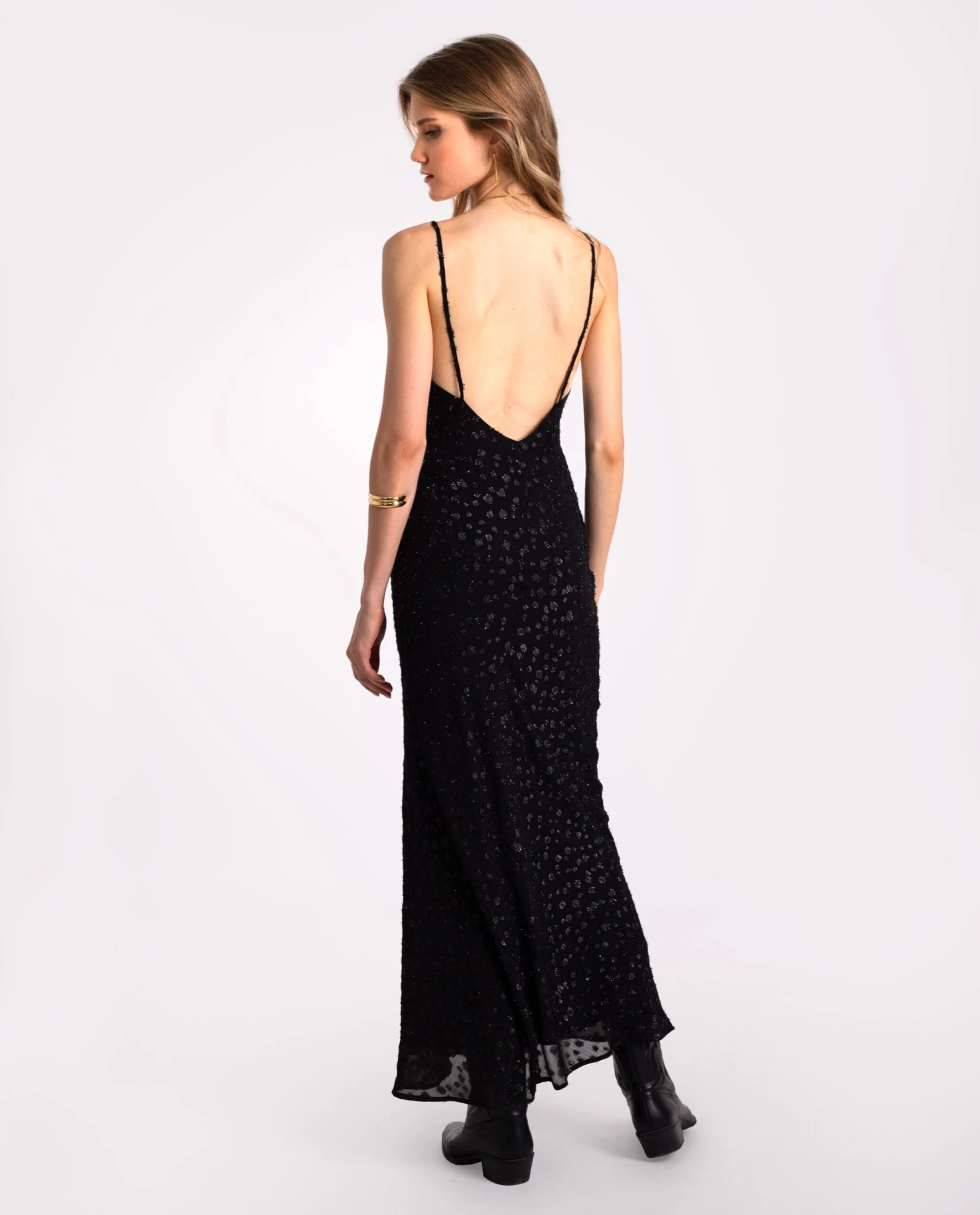 Vestido lencero de tirantes con plumeti y brillo.[readmore]Este vestido lencero es ideal para ocasiones especiales, con un diseño que combina elegancia y versatilidad. Confeccionado en una delicada gasa negra con plumeti bordado e hilos de brillo, cuenta con finos tirantes que dejan la espalda completamente descubierta. Su bajo con vuelo añade movimiento al caminar, creando un look sofisticado. Es una prenda que puedes adaptar fácilmente según los accesorios para un estilo más casual o arreglado.