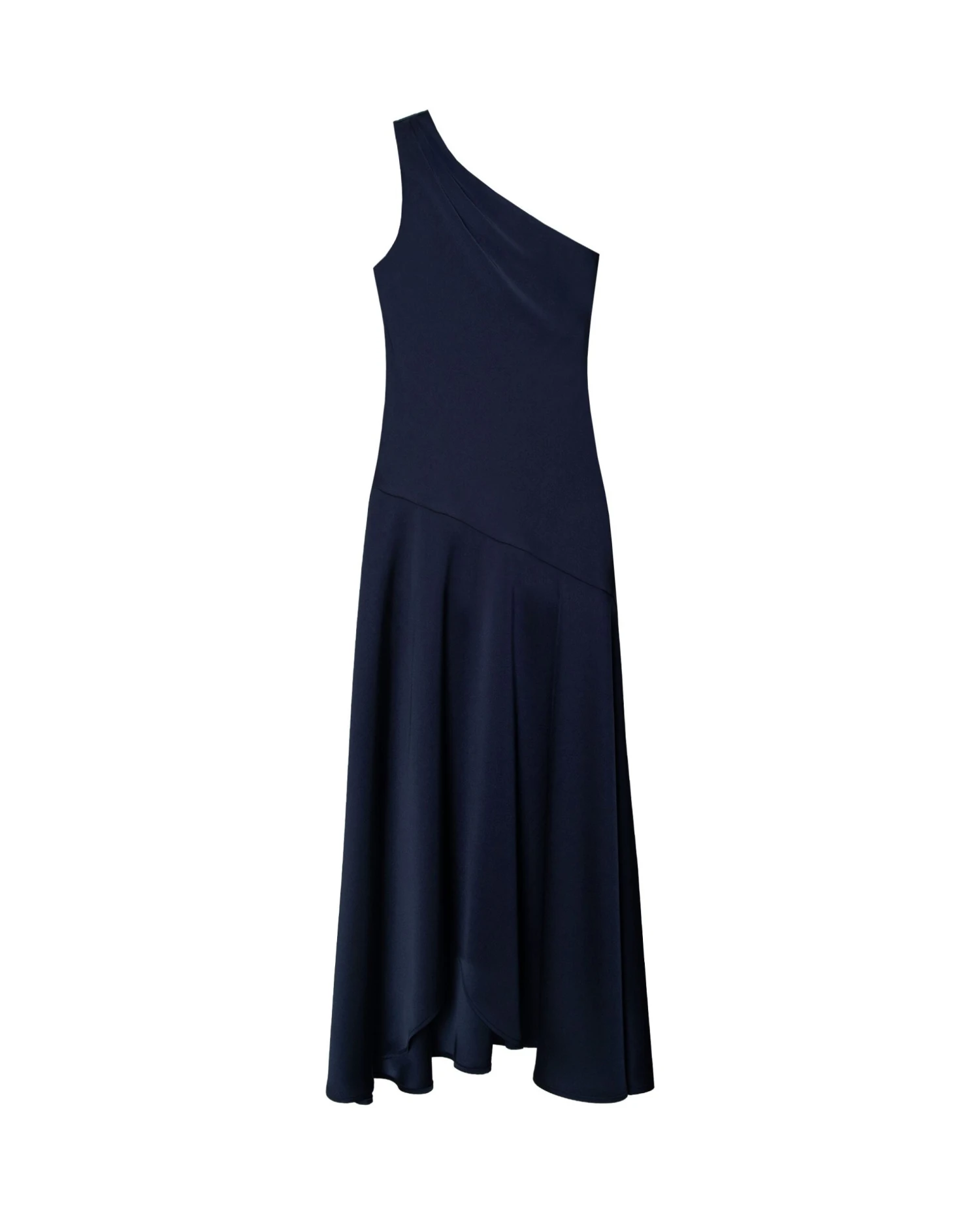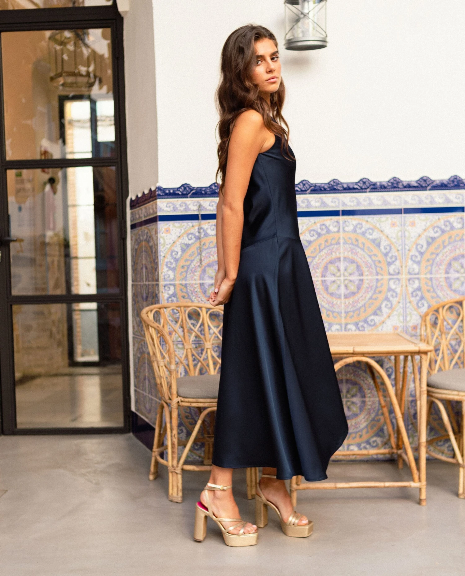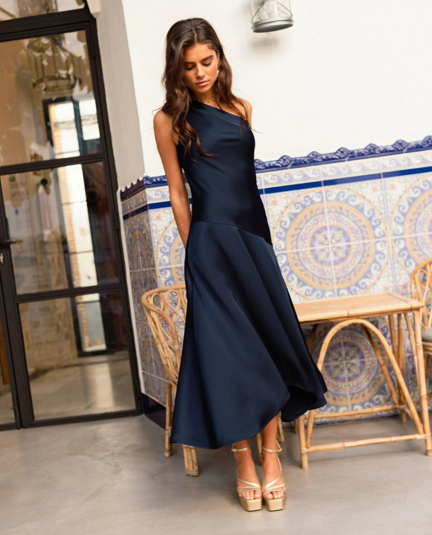 Vestido midi azul marino asimétrico con falda capa.[readmore]Un diseño sofisticado que te hará destacar en cualquier evento de largo o de noche. Tiene el escote asimétrico con detalle de pliegues en el hombro que le dan un toque especial. El corte a la cadera da paso a una falda con capa que aporta movimiento y fluidez al caminar, no puede ser más elegante. Está confeccionado en un tejido satinado con un brillo sutil y un corte al bies para que se adapte al cuerpo sin marcar. Combínalo con una de nuestras sandalias de fiesta y complementos de invitada.