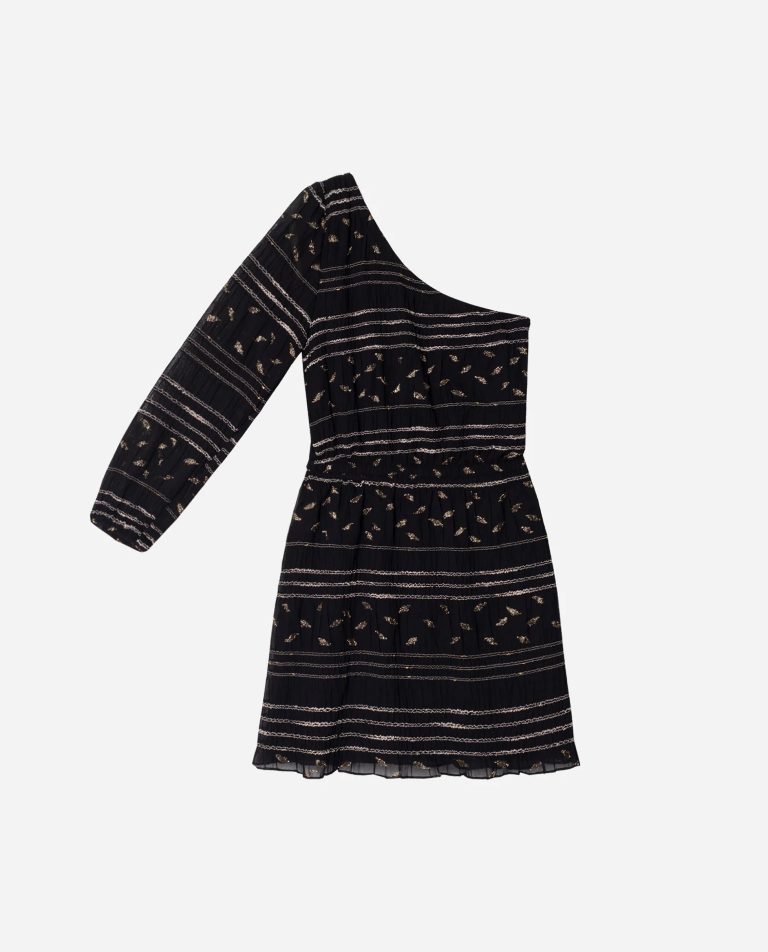Vestido negro corto asimétrico de gasa con brillo dorado.[readmore]Tienes delante uno de los vestidos más ideales para llevar estas fiestas!!😍Confeccionado en un tejido de gasa con un poco de brillo y estampado étnico. Lo hemos diseñado con el escote asimétrico y la manga ligeramente abullonada, con una cintura elástica para que se adapte a tu silueta. El detalle de los brillos en dorado hace que sea un vestido aún más especial. Hazte con él antes de que las tallas vuelen!