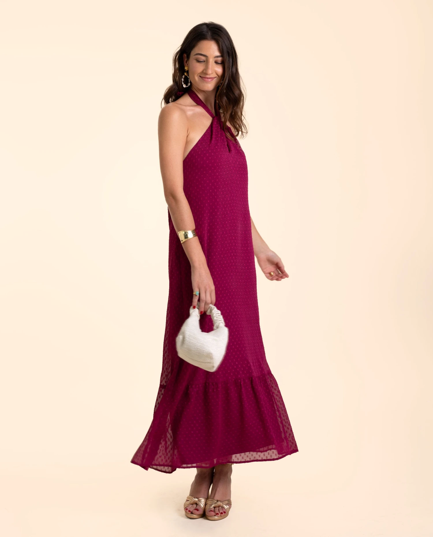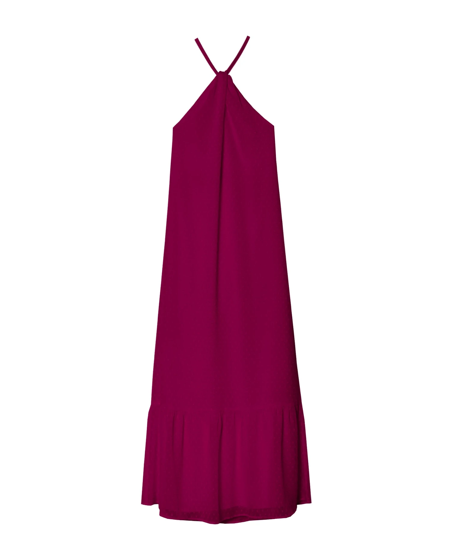 Vestido midi plumeti ciruela con escote halter cruzado y espalda baja.[readmore]Uno de los vestidos de invitada más especiales para arrasar en cualquier evento.😍El tejido plumeti es ideal, con pequeños puntos en relieve y un nudo en el escote que favorece mucho. Imagínatelo morena! Tiene la espalda descubierta y un volante en el bajo para que tenga mucho movimiento al caminar. Es el vestido perfecto para combinar de mil formas y llevar en diferentes ocasiones, ya sea con una sandalia de tacón o una sandalia plana para verano.