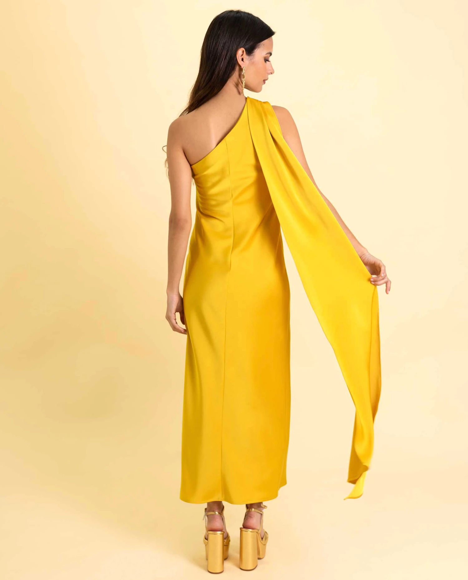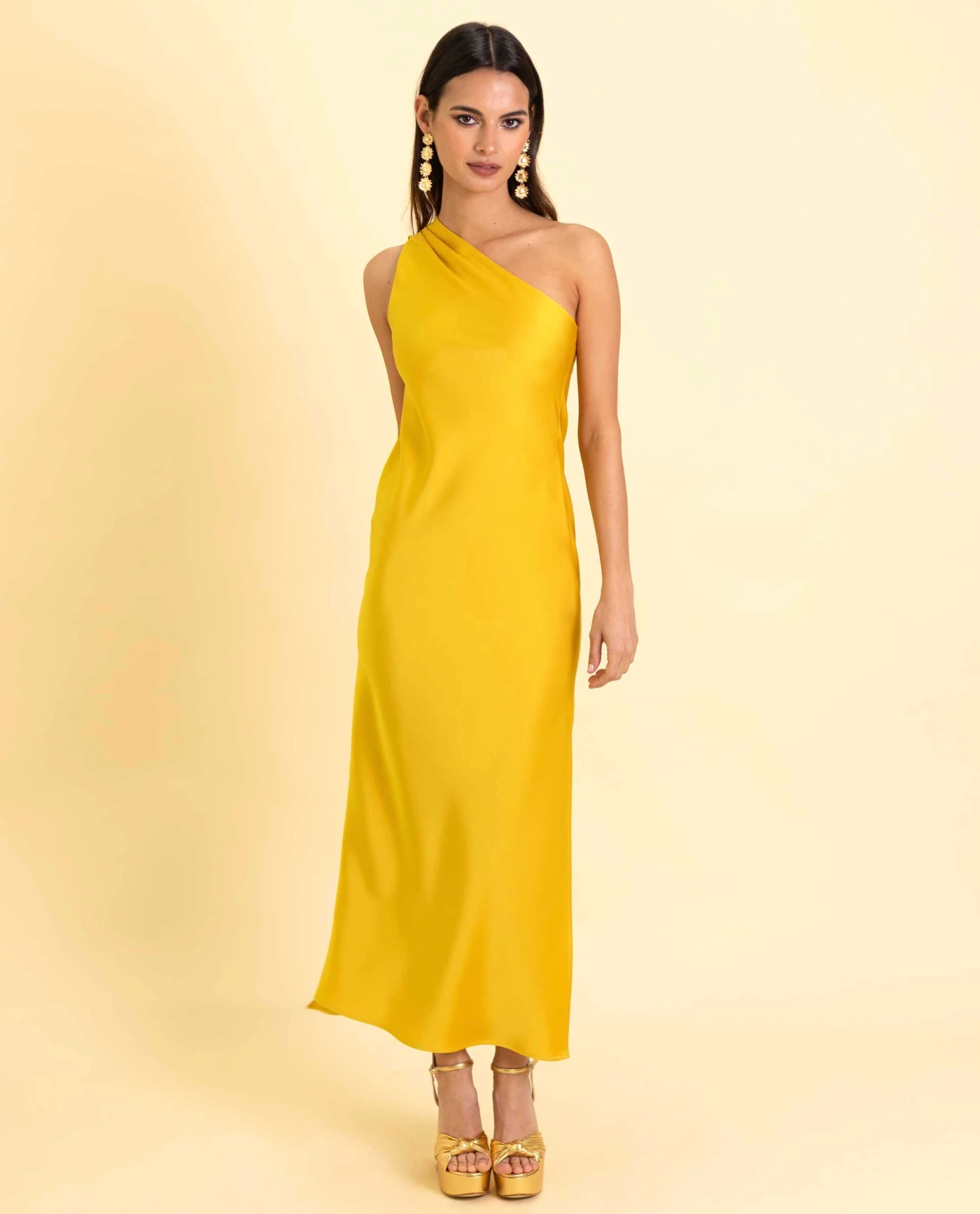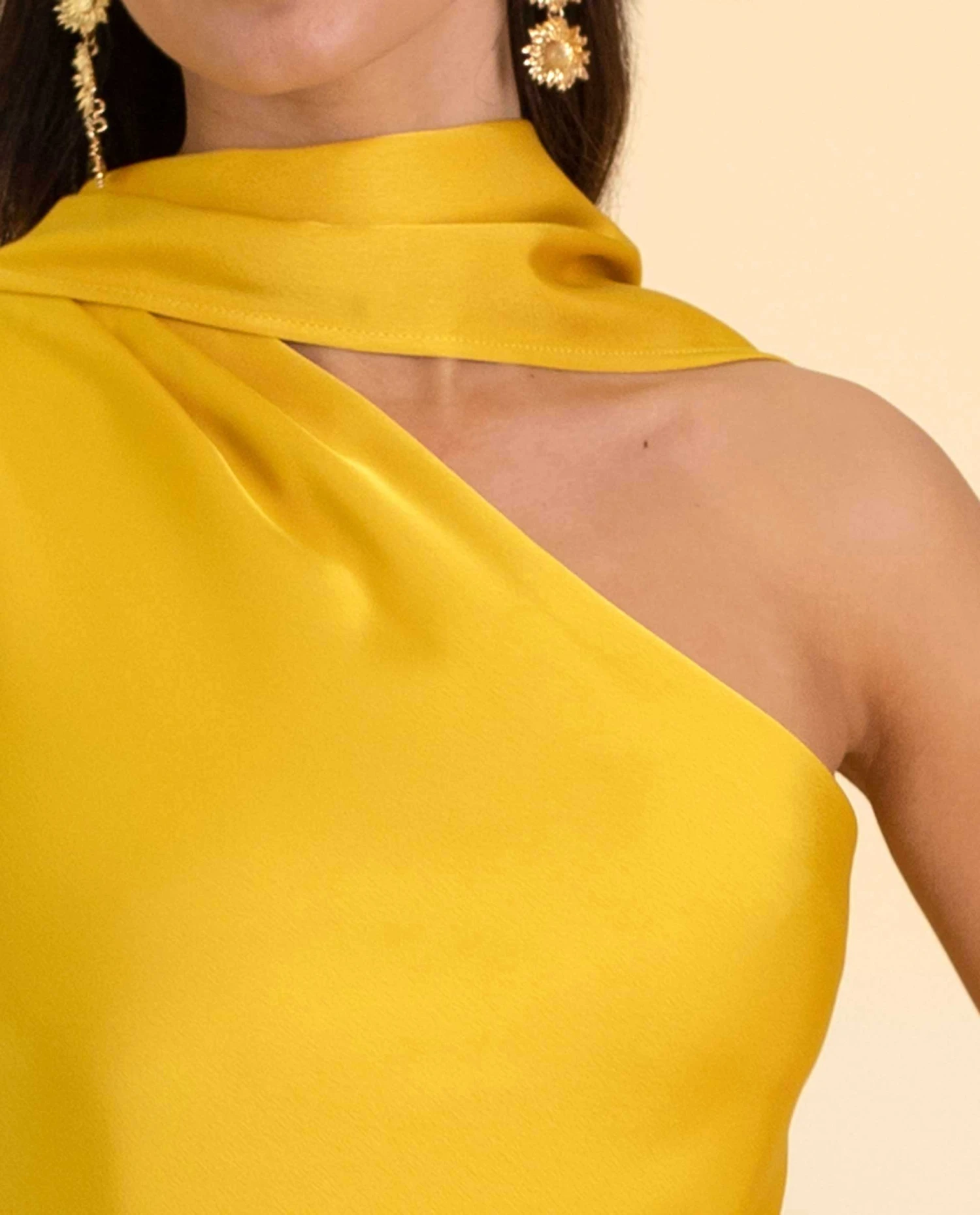 Vestido midi amarillo asimétrico con lazada al cuello.[readmore]Este vestido amarillo midi será la pieza perfecta para cualquier invitada que busque un look elegante y sofisticado. Diseñado para que una vez te lo pruebes te sientas espectacular! Confeccionado en un suave tejido satinado amarillo, un color súper favorecedor y perfecto para el buen tiempo. Con su escote asimétrico drapeado y el cuello alto con una elegante lazada, este vestido amarillo es sinónimo de elegancia. El efecto chal de invitada añade un toque original y tendencia al look. Elígelo ahora y prueba a combinarlo con accesorios en dorado, es el match perfecto!❤️
