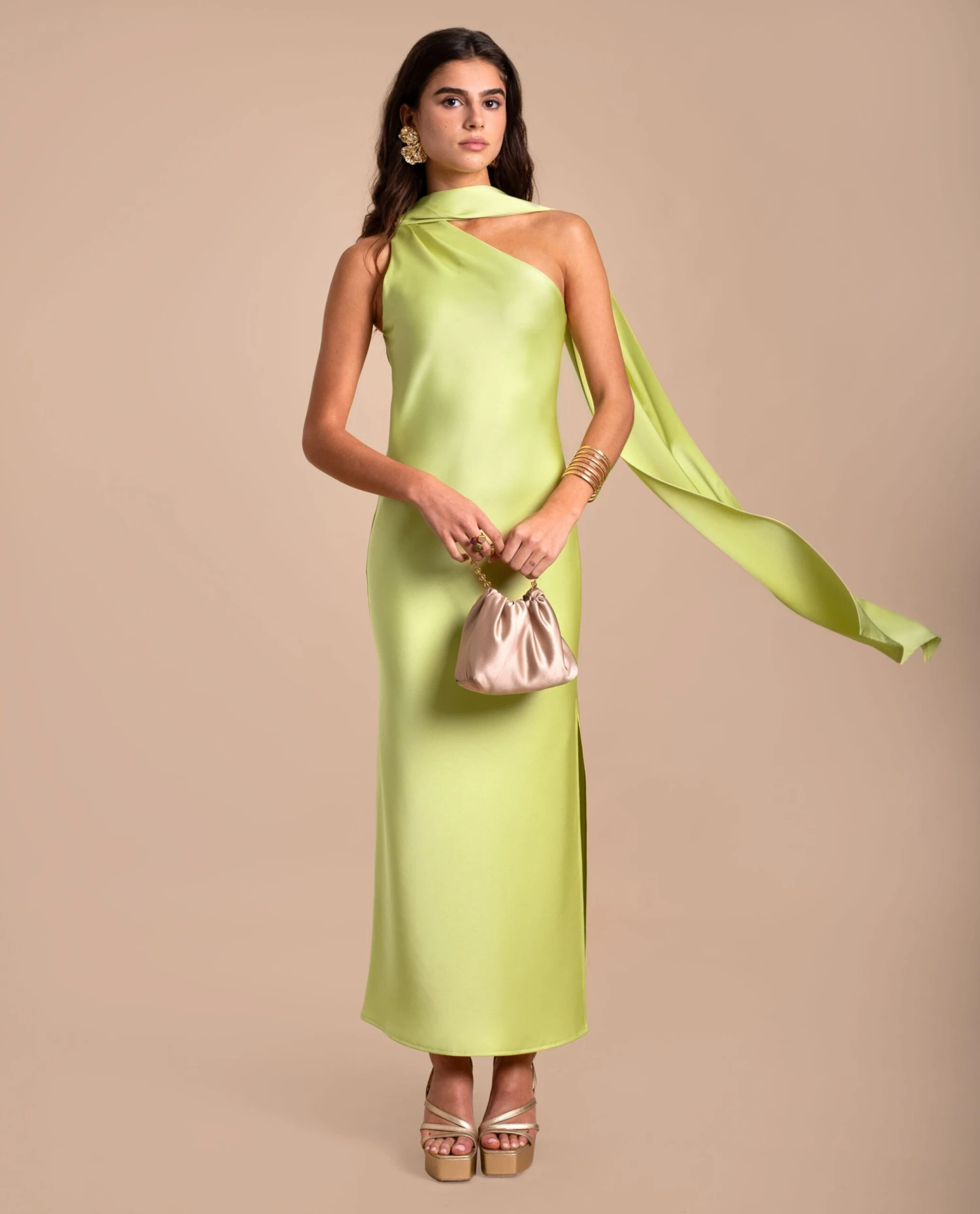 Vestido midi verde lima asimétrico con lazada al cuello.[readmore]Este vestido verde midi será la pieza perfecta para cualquier invitada que busque un look elegante y sofisticado. Confeccionado en un tejido verde lima satinado, el color por excelencia para acudir a un evento especial. Con su escote asimétrico drapeado y el cuello alto con una elegante lazada, este vestido verde es sinónimo de elegancia. El efecto chal de invitada añade un toque original y tendencia al look. Elígelo ahora y prueba a combinarlo con accesorios en dorado, es el match perfecto!