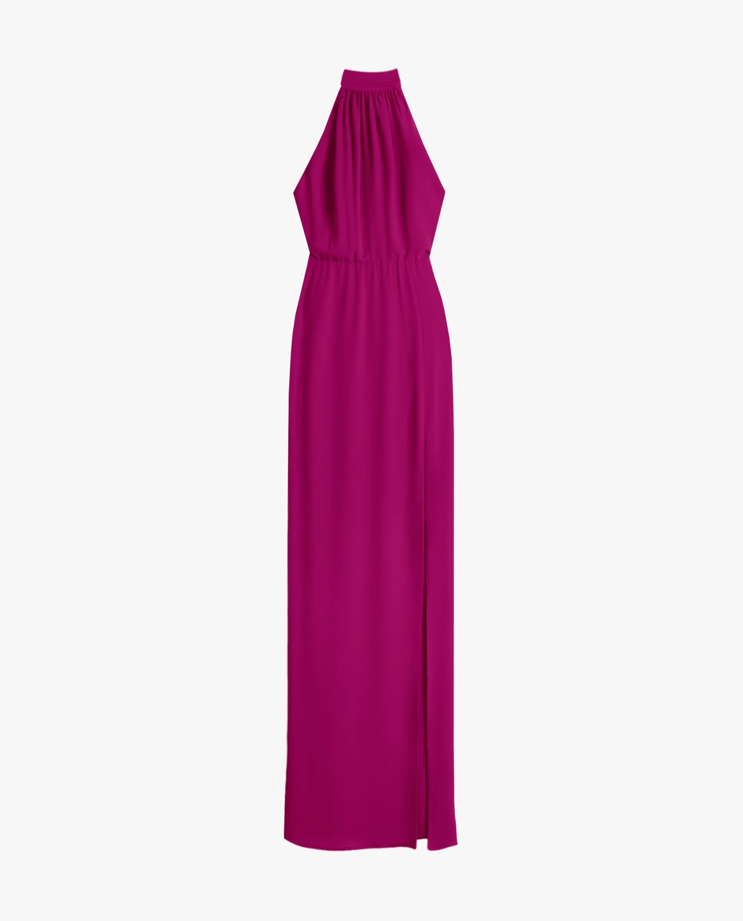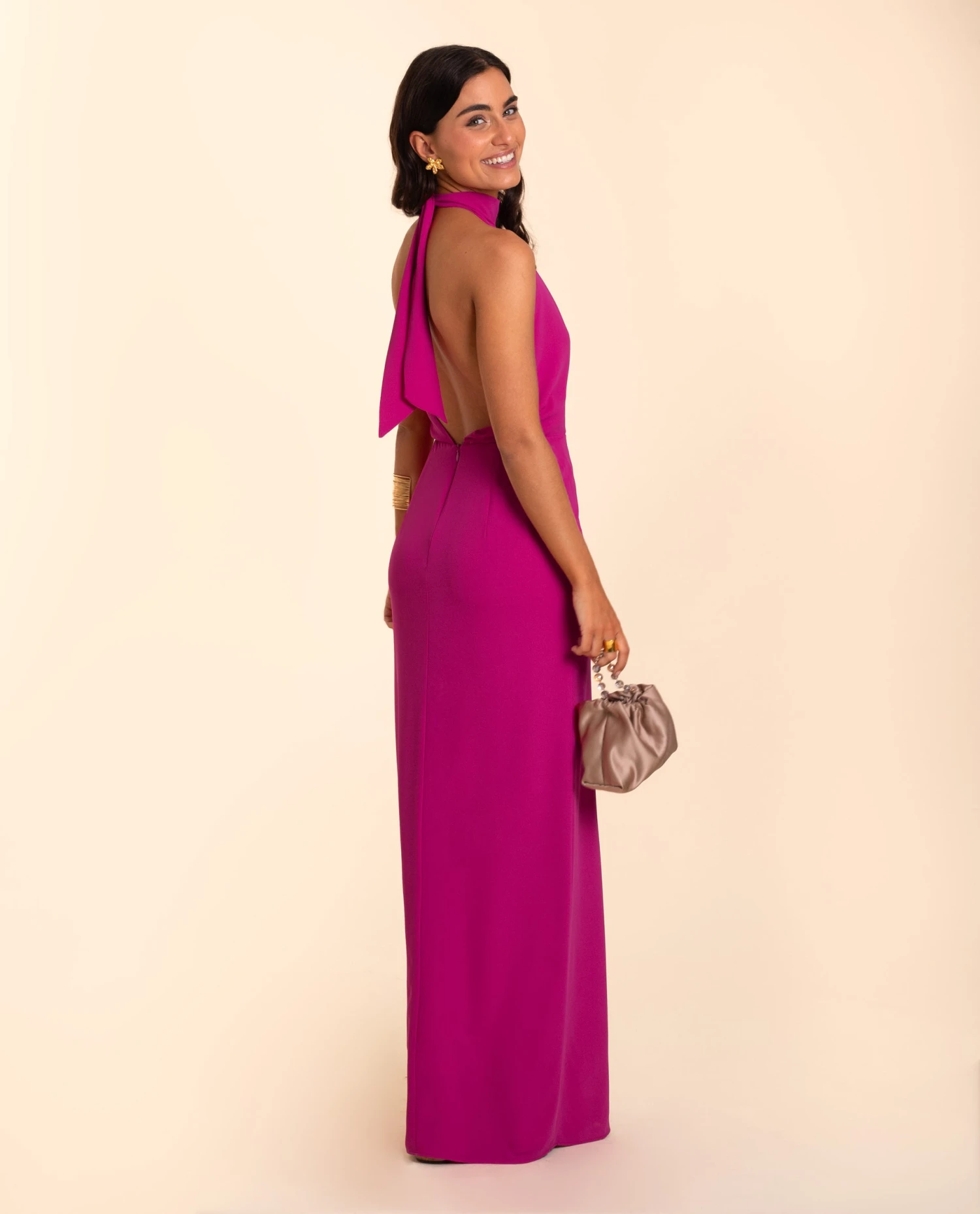Vestido largo elegante de invitada con cuello halter.[readmore]El vestido que buscas para convertirte en la invitada más elegante. Apostamos por este vestido de fiesta largo confeccionado en un tejido gasa fucsia, el color más buscado de la temporada. El cuerpo tiene el escote halter y va sujeto al cuello con una lazada, dejando la espalda completamente descubierta. Su patrón no puede ser más favorecedor, ajustado a la cintura para marcar silueta y la abertura de la pierna al caminar. Combínalo con unos pendientes largos doraros, un clutch de mano y una de nuestras sandalias de fiesta para un total look de invitada perfecto.