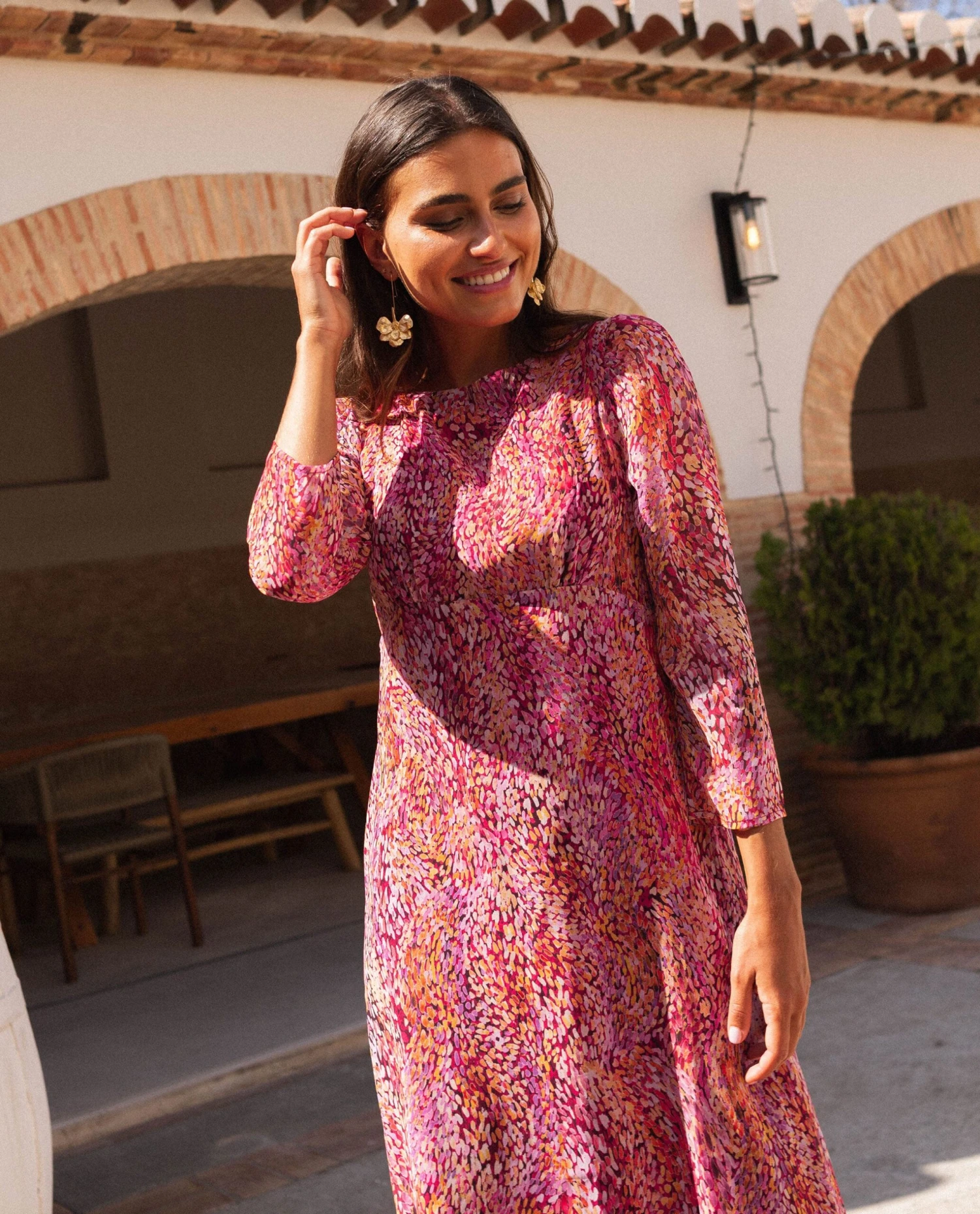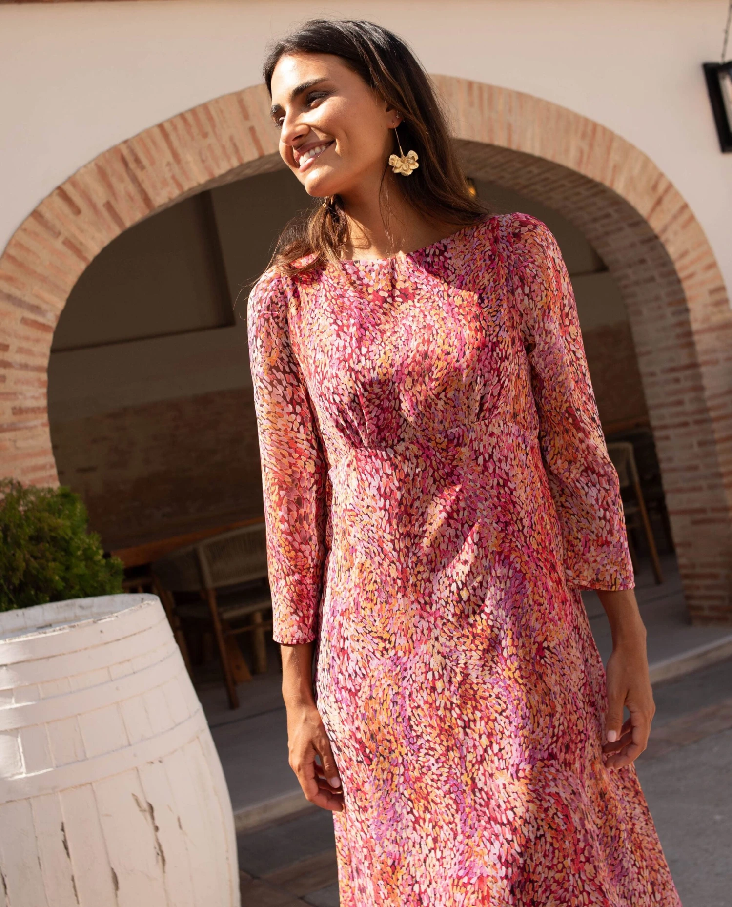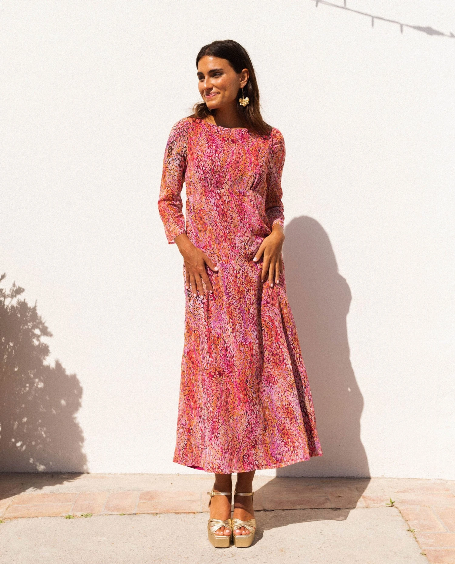 Vestido midi elegante estampado con manga larga.[readmore]Diseñamos desde 0 este print tan especial para que cuando elijas este vestido midi de invitadas sientas que llevas un look elegante, fresco y original. El tejido es el de una gasa muy ligera, con el detalle de hilo de lurex con un poco de brillo para hacerlo aún más especial. Lleva el cuello cerrado, manga larga un poco abullonada y es ajustado en la parte de arriba. La falda es un poco evasé con vuelo, muy favorecedor. Todos sus detalles apuntan a que se va a convertir en el vestido más buscado de invitadas, aprovecha para hacerte con él antes de que se agote.🤞🏻
