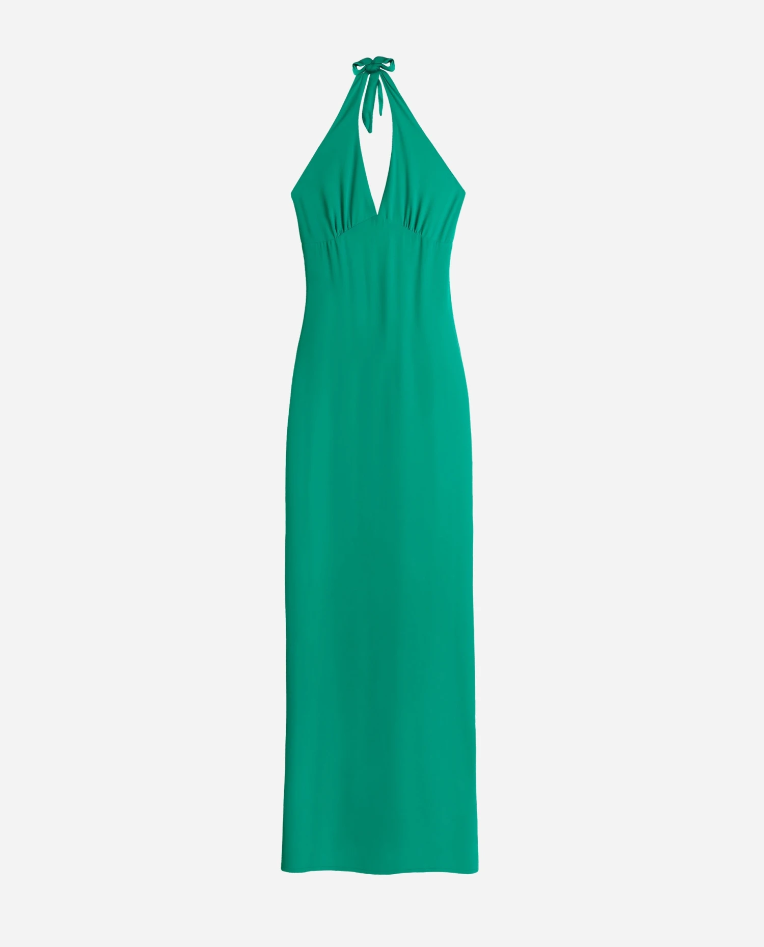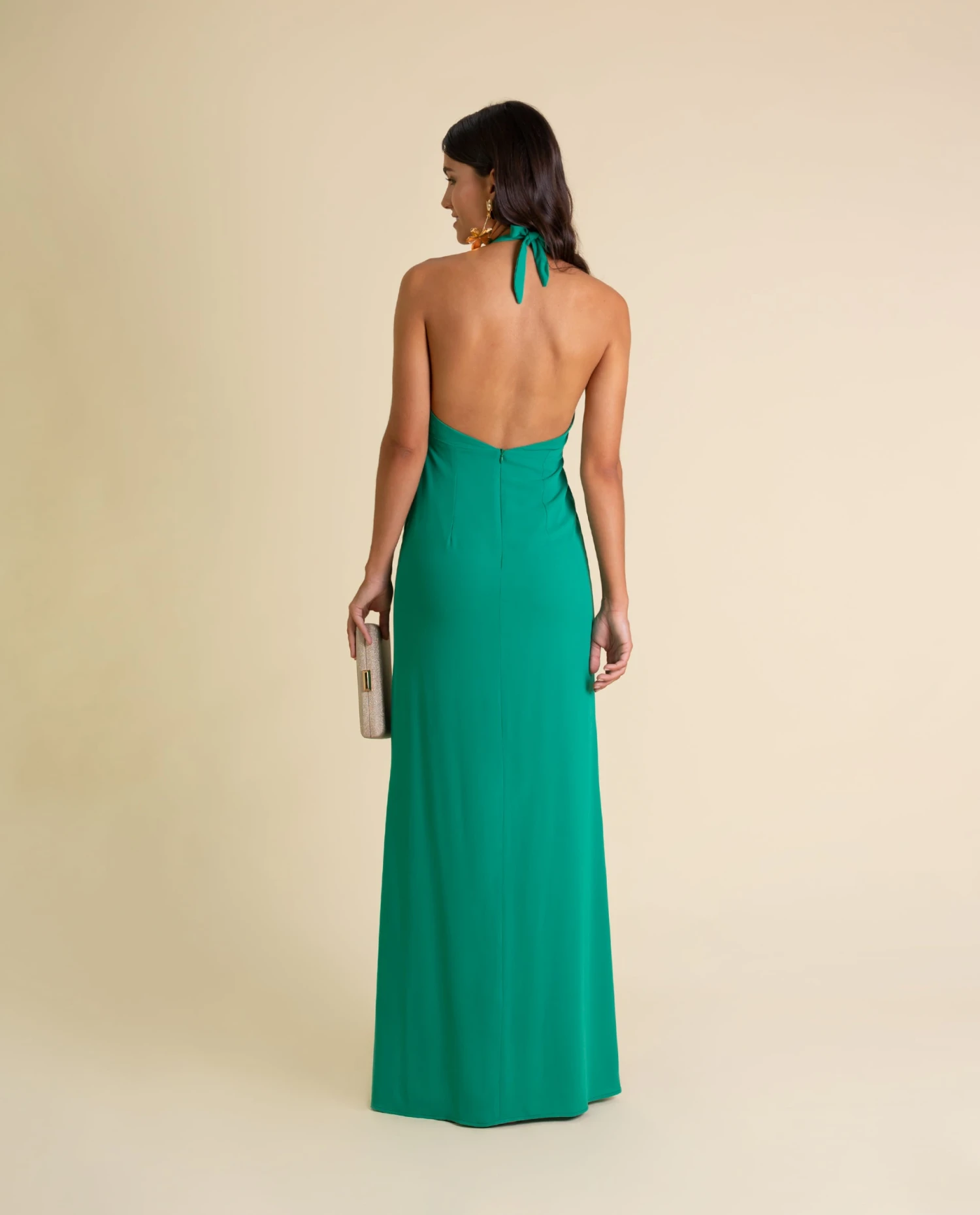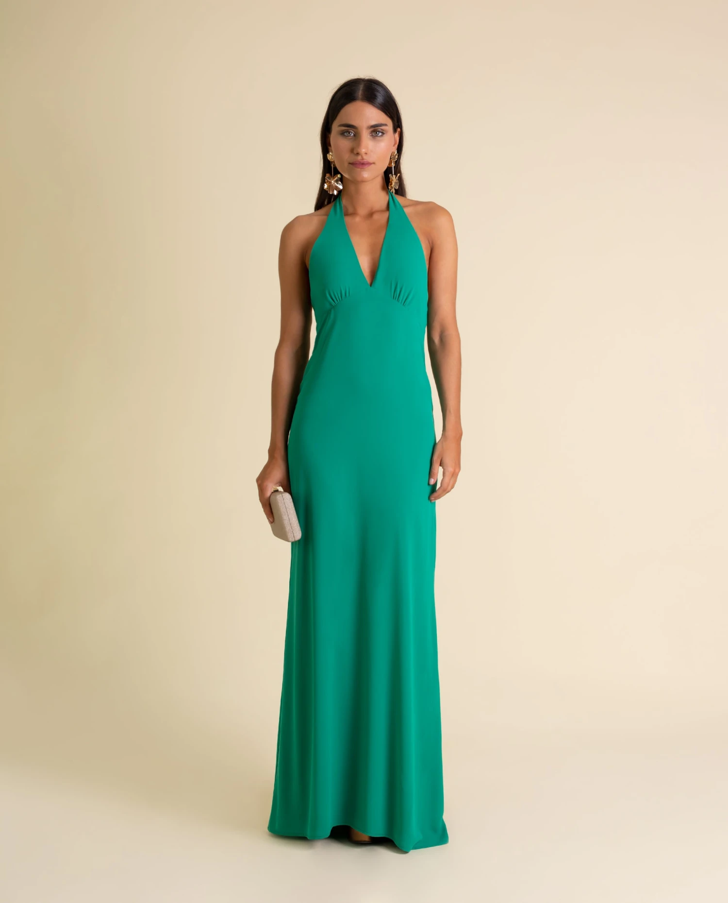 Vestido largo sin mangas anudado al cuello.[readmore]Este vestido verde será la prenda perfecta para cualquier invitada que busque un look elegante con un punto sexy. Nuestro equipo de diseño ha trabajado en el patrón de este vestido para que siente perfecto, con la espalda descubierta y detalles que lo convierten en una pieza muy especial: escote en ‘v’ drapeado, con lazada al cuello para que quede muy acoplado al pecho y lo lleves cómodo y de corte evasé para aportar la caída perfecta. El tejido es un crep verde, uno de los colores favoritos para vestir en todo tipo de eventos. Combínalo con unos accesorios dorados para convertirte en la invitada perfecta. ✨