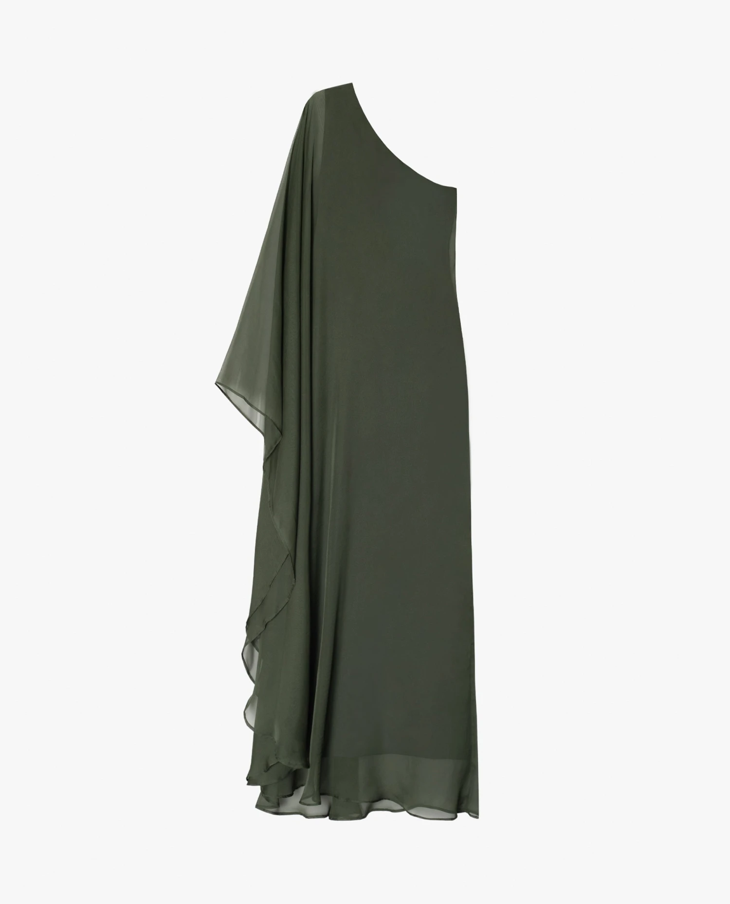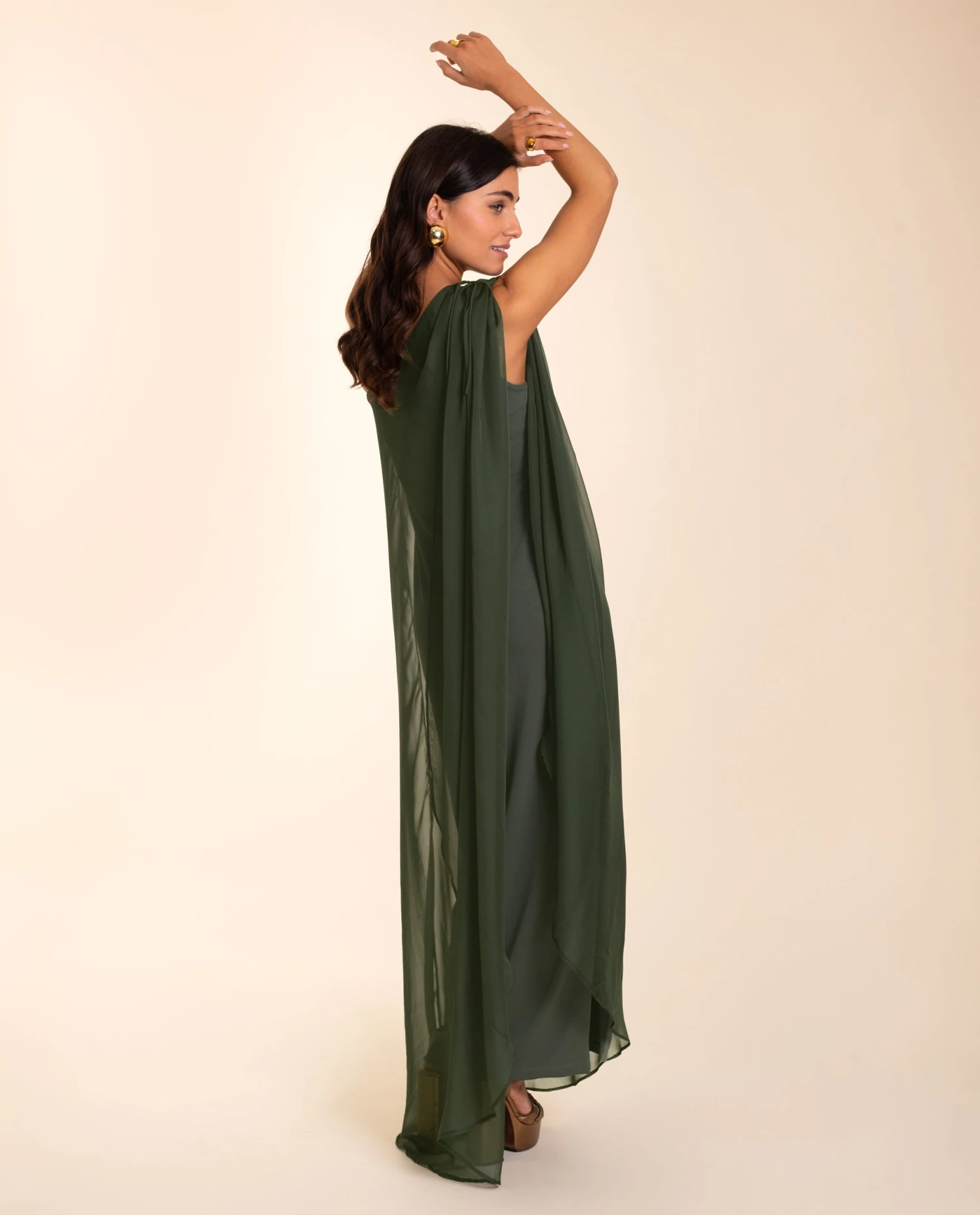 Vestido largo fluido con capa asimétrica.[readmore]Una de las piezas más especiales de la colección de invitada por su forma, diseño y tejido. Es un vestido elegante confeccionado en doble gasa con mucho movimiento que no marca nada, lo llevarás muy cómodo a tus eventos más especiales. El efecto capa es uno de los elementos más buscados en invitadas, así que nuestro equipo de diseño lo ha incorporado en forma de multiposición. Gracias a su lazada en el hombro podrás ajustar la capa y llevarla abierta como manga o tipo tirante.