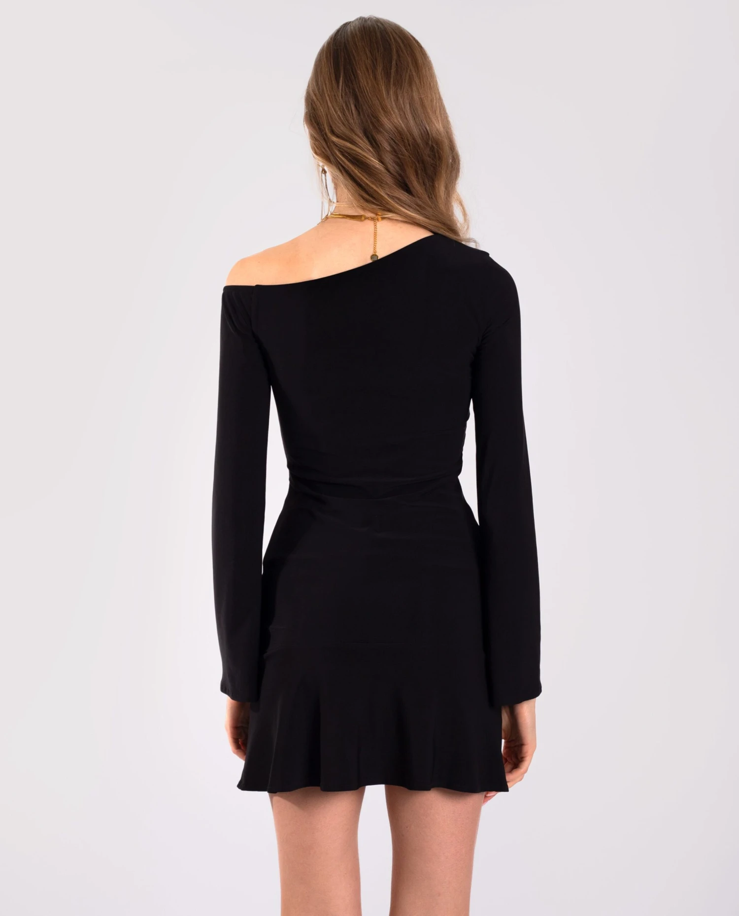 - Vestido corto negro de manga larga.
