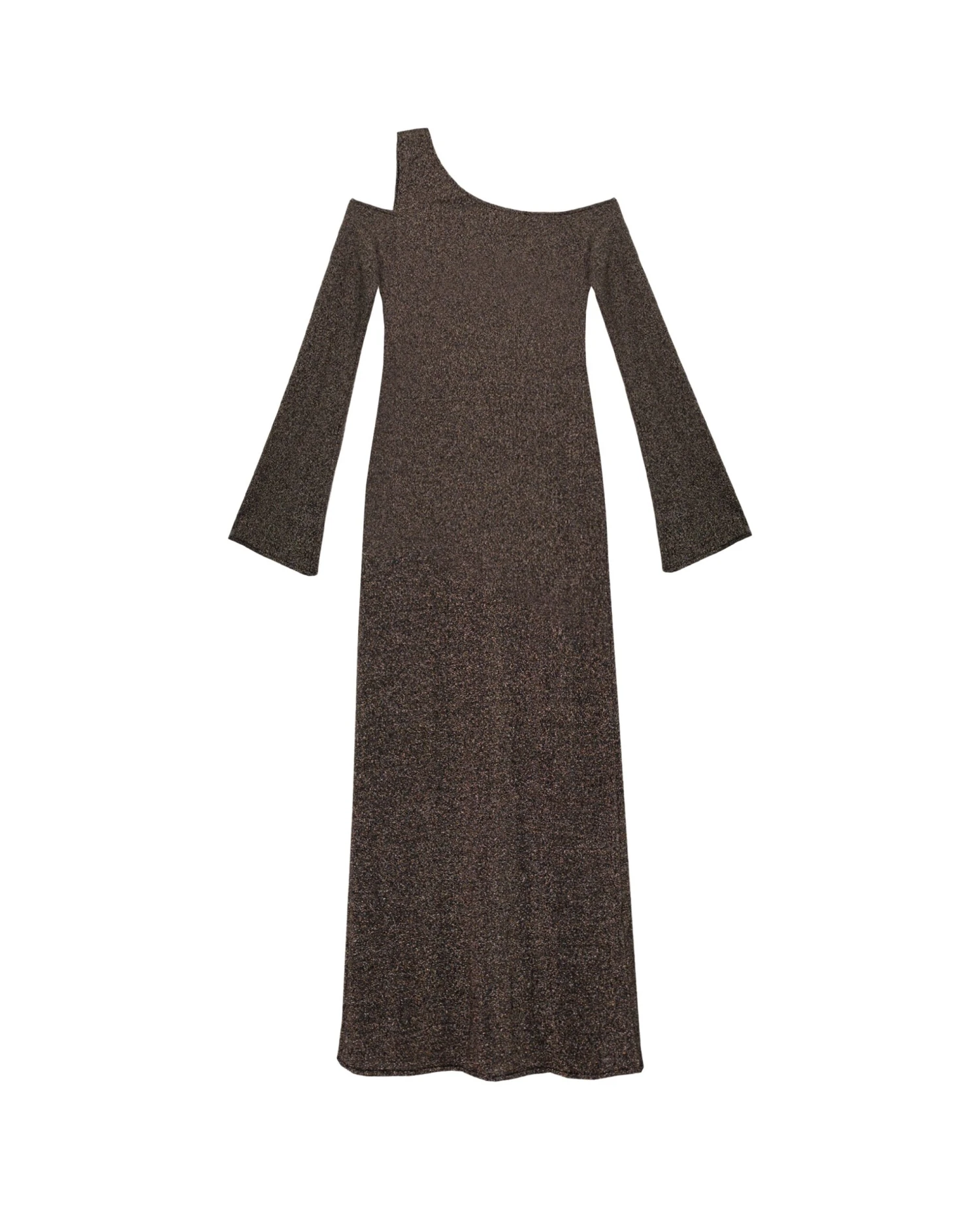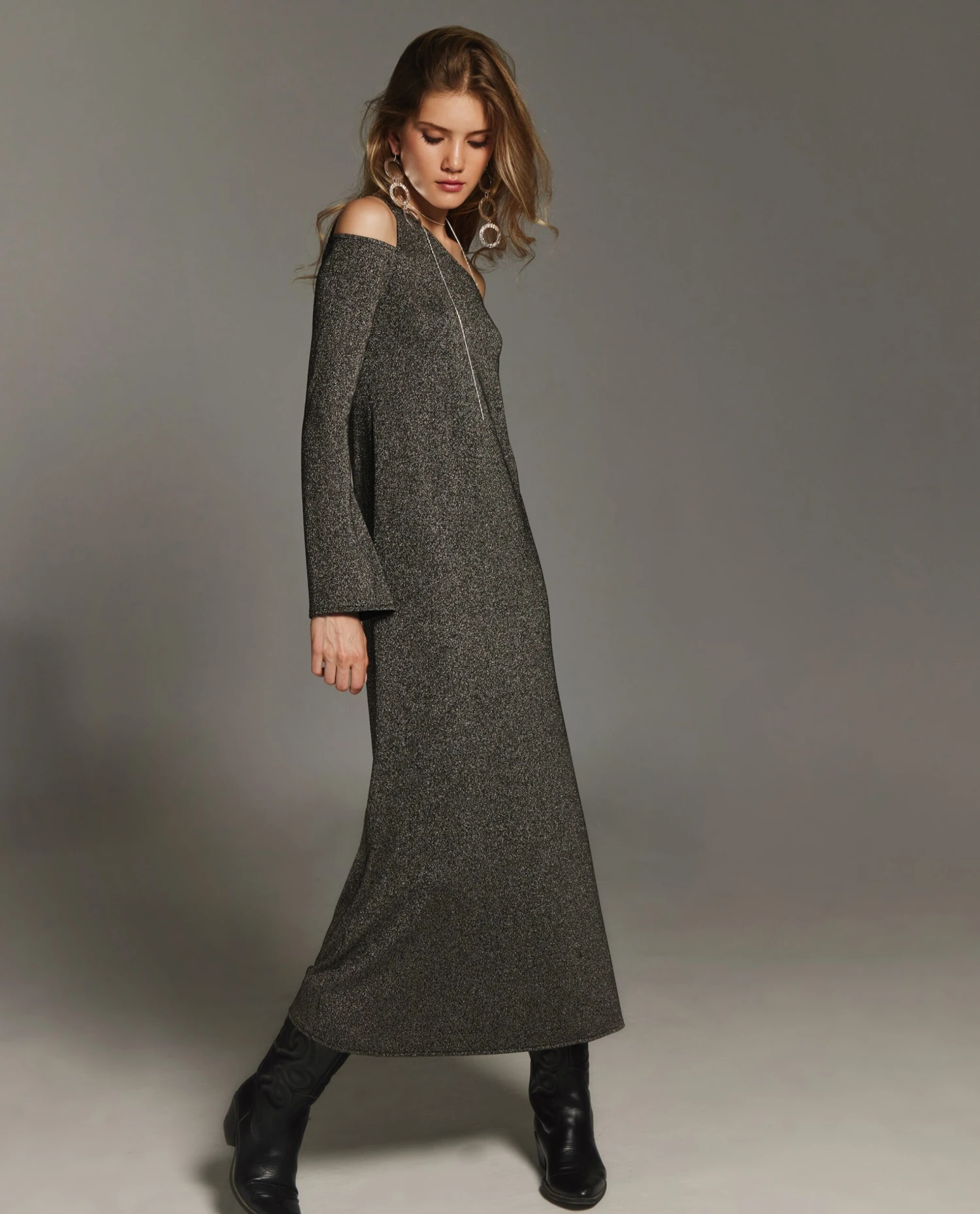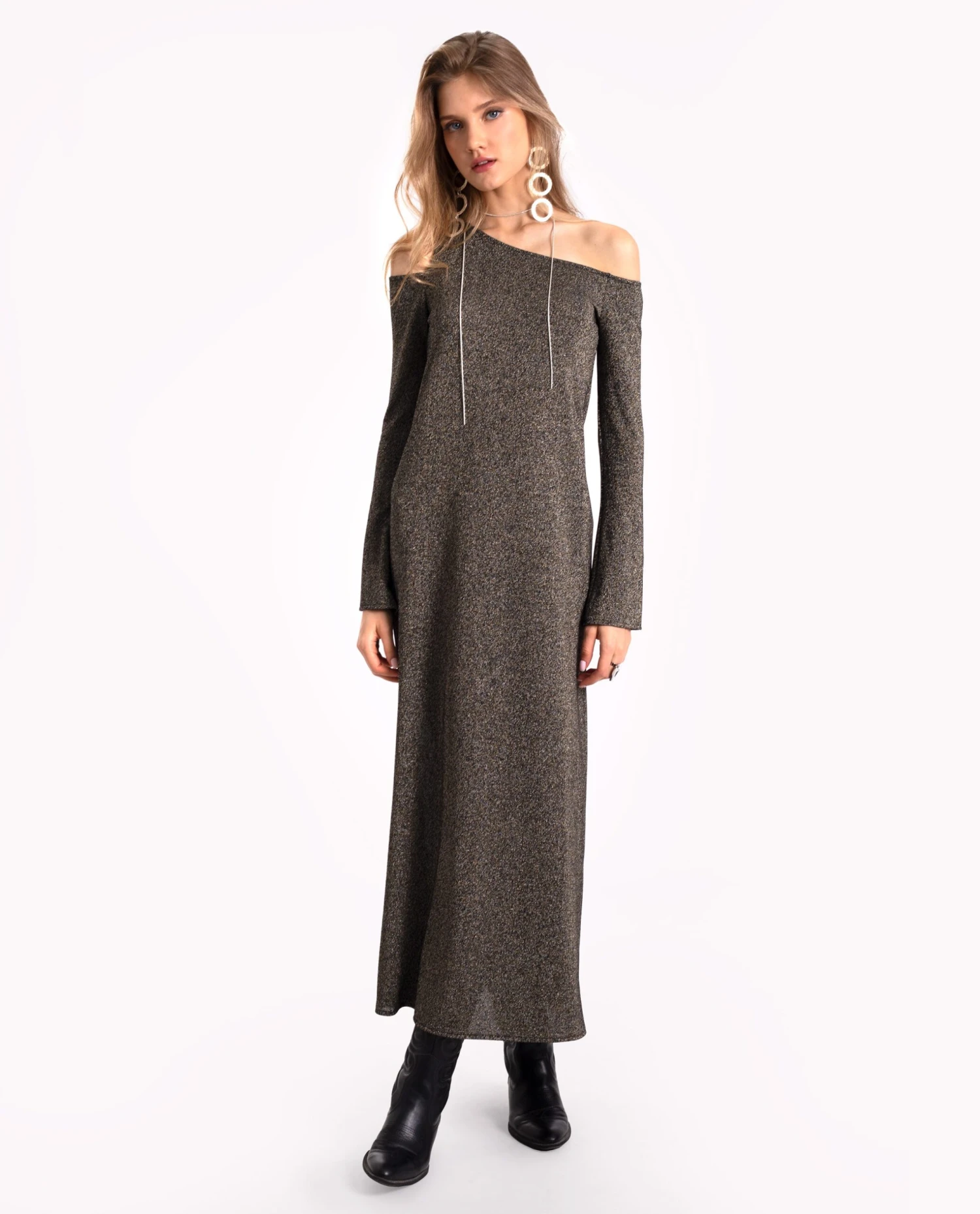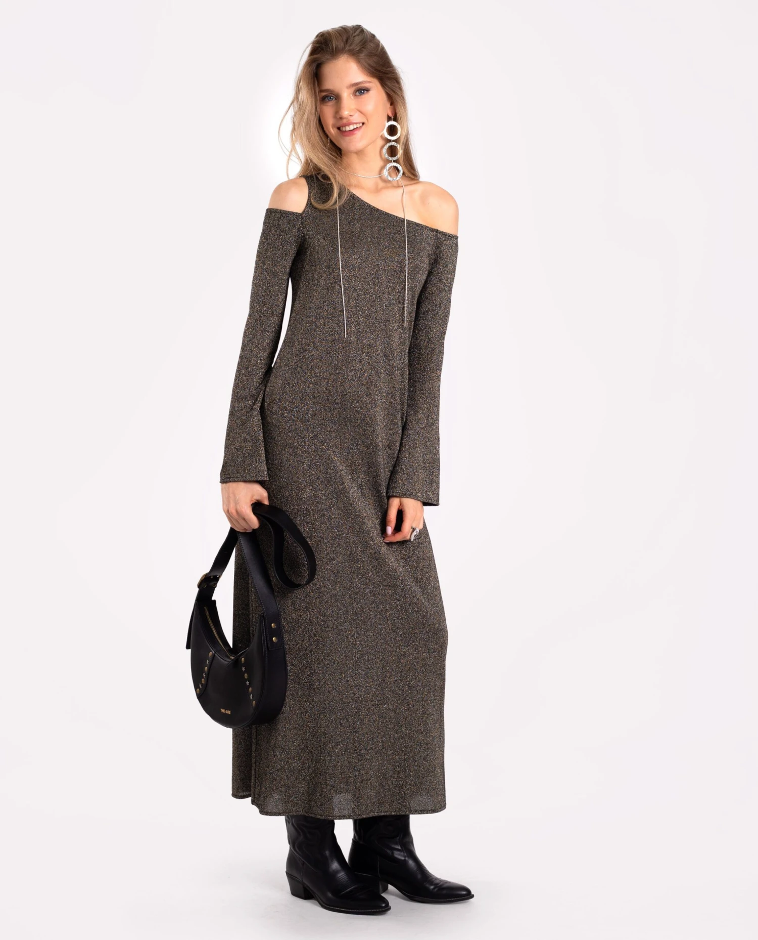 Vestido midi de manga larga con brillo y escote asimétrico.[readmore]Este vestido es una de nuestras piezas favoritas por su versatilidad, perfecto tanto para el día a día como para eventos especiales. Confeccionado en punto canalé elástico con mucho brillo, destaca por su diseño entallado que favorece la silueta sin perder comodidad. Tiene el escote asimétrico con un elegante cut out en el hombro derecho y las mangas ligeramente acampanadas. ¡Combínalo con accesorios dorados y zapatillas para un look de 10!