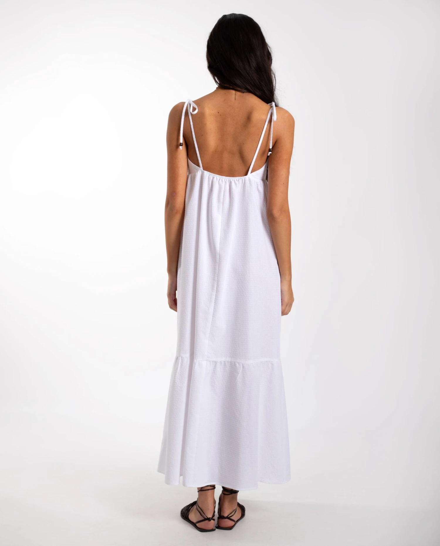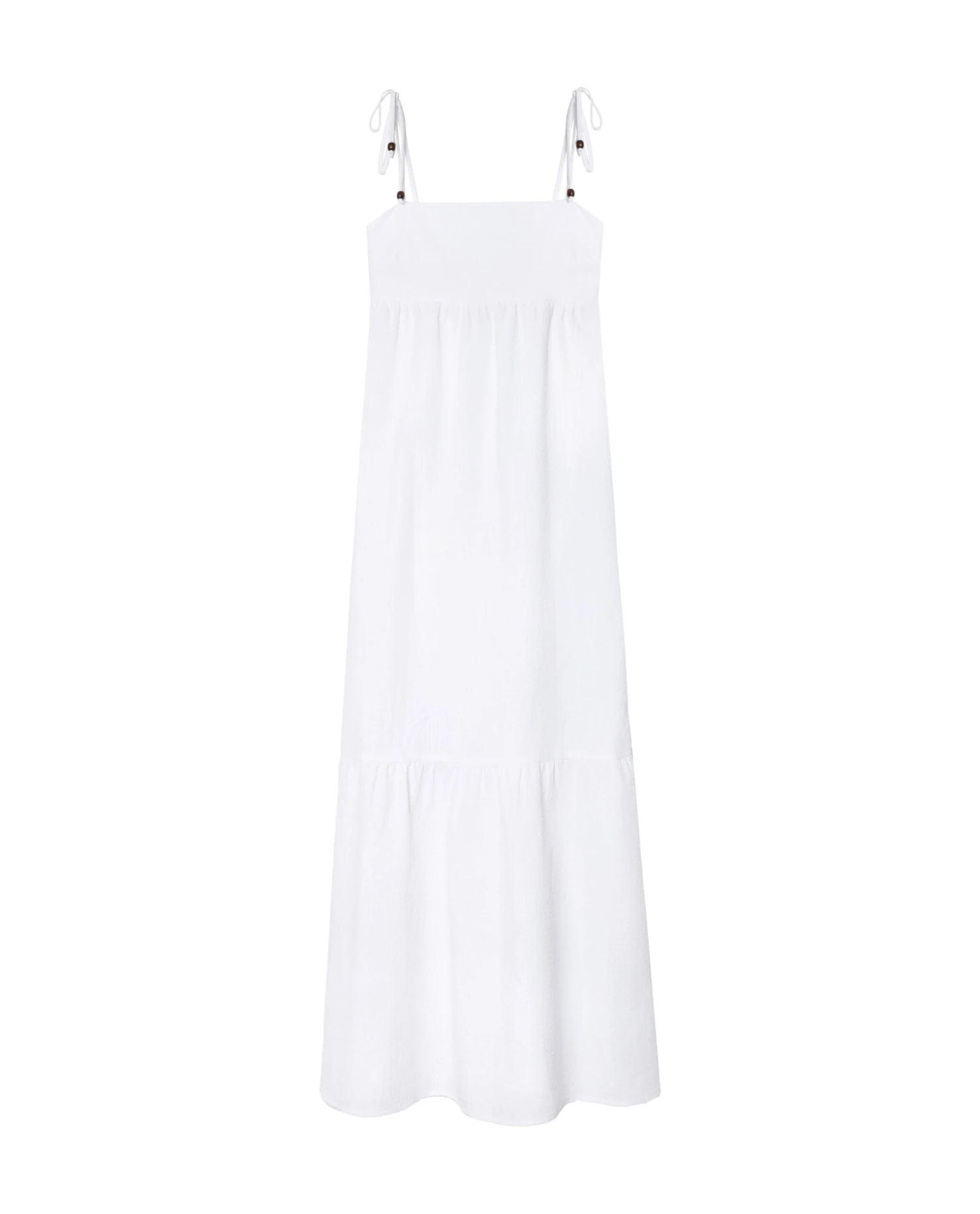 Vestido largo blanco con textura.[readmore]El vestido que querrás llevar todo el verano. Su escote palabra de honor con tirantes regulables te permite ajustarlo a tu medida, mientras que su tejido con textura le da un toque especial. El corte largo con volante en el bajo aporta movimiento y frescura, perfecto para días de calor. Llévalo con sandalias planas para un look casual o con tus botas cowboy favoritas para un extra de estilo.