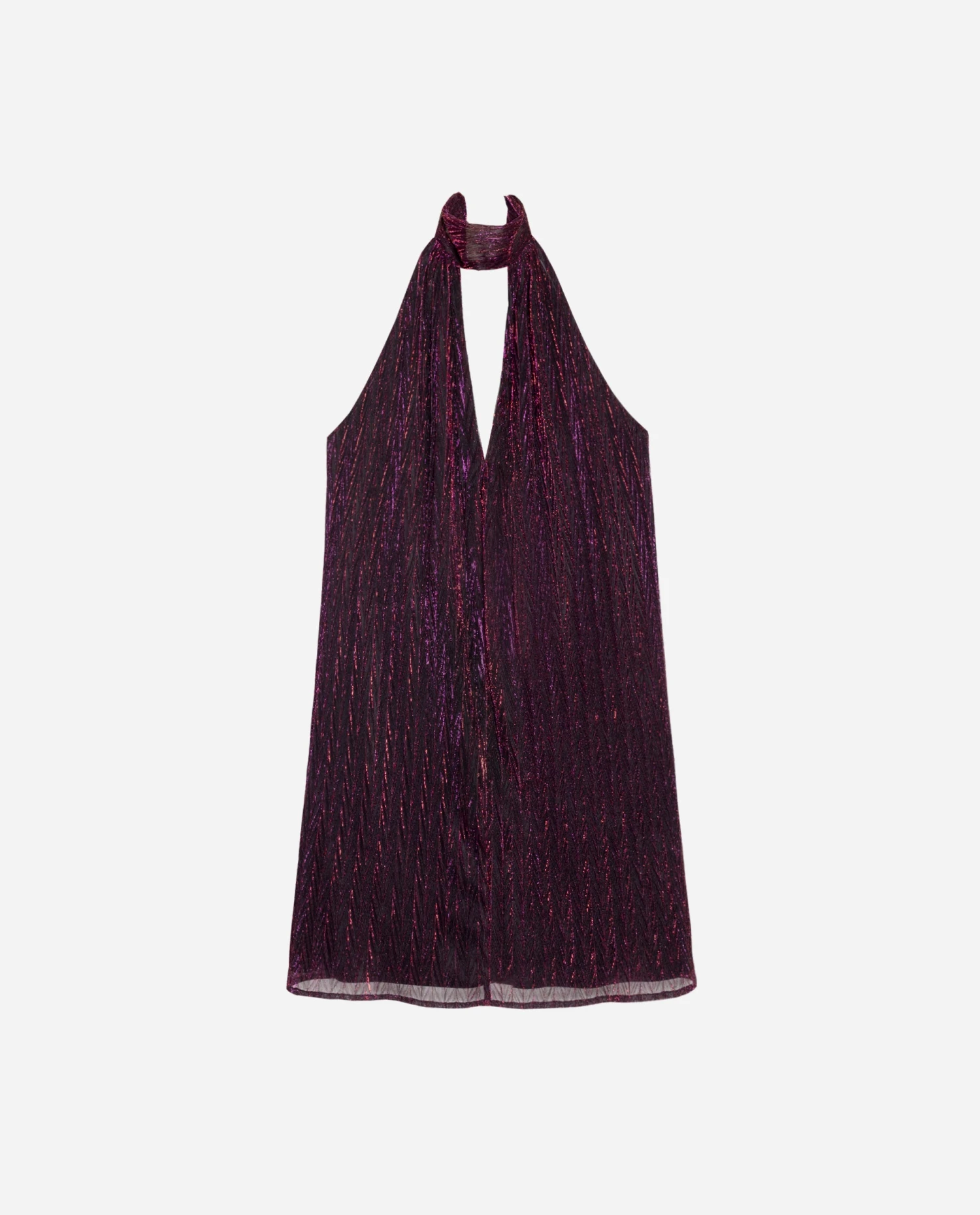 Vestido corto con escote halter y espalda descubierta.[readmore]En esta colección hemos apostado por el brillo y sí, hemos diseñado el vestido que llevarás en todas tus fiestas de Navidad. Comodísima, con mucho estilo y siempre perfecta. Es un vestido corto confeccionado en un tejido plisado con mucha caída, con escote halter y lazada al cuello regulable para que sea fácil de llevar. El punto sexy lo aporta su espalda totalmente descubierta y el brillo plateado sobre el morado es la combinación perfecta de elegancia. Añádelo ya a tu colección porque con él siempre irás perfecta!