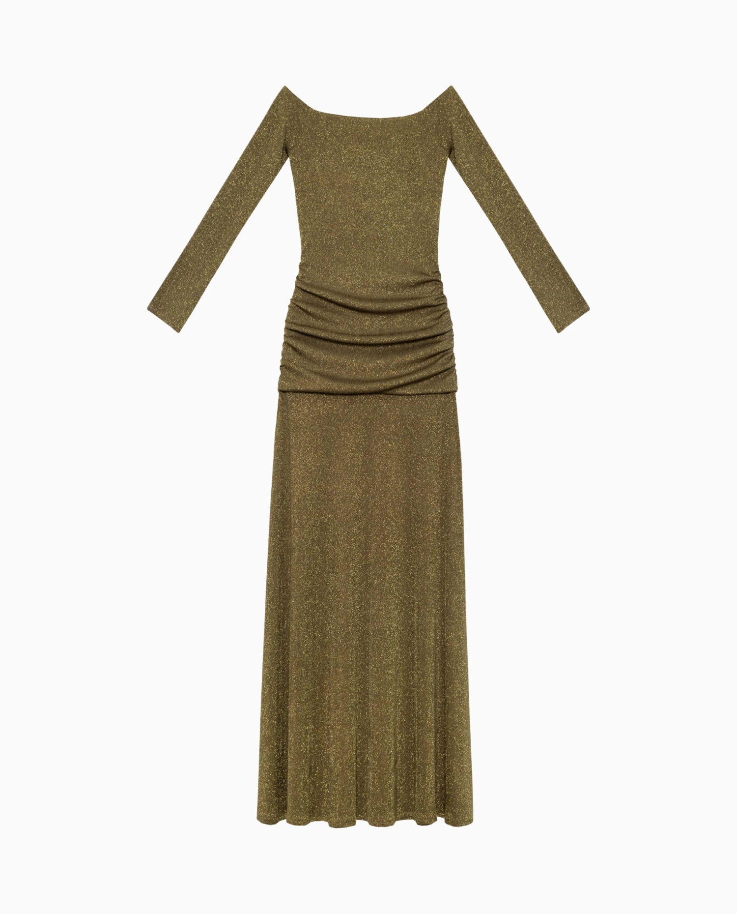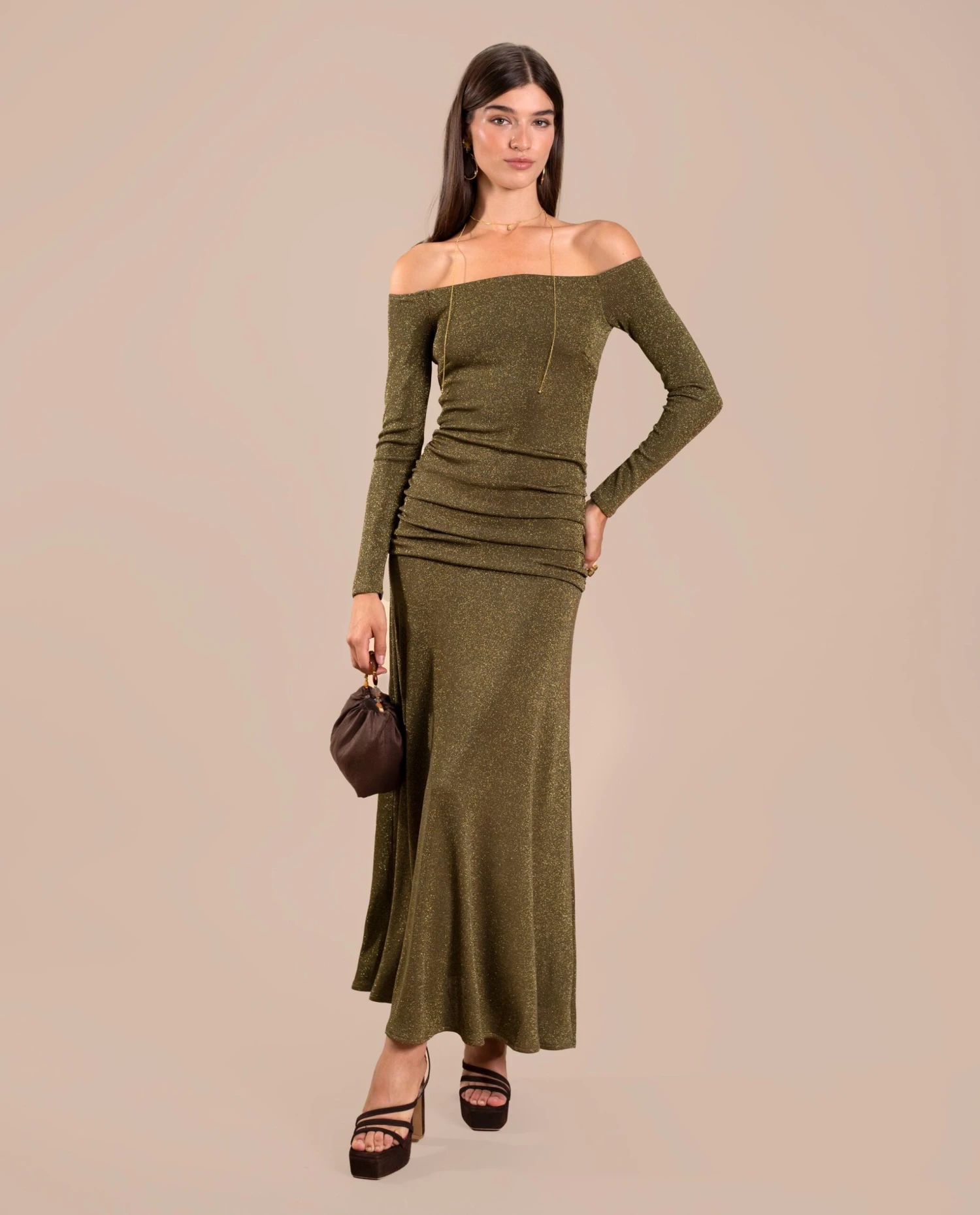 Vestido midi de punto con escote bardot.[readmore]Si tienes un evento especial y buscas un look que esté a la altura, el vestido Sophie es la opción ideal. Su escote bardot deja los hombros al descubierto, añadiendo un toque de elegancia y tendencia al look. Está confeccionado en un tejido de punto elástico con hilos de lurex dorados que aportan un brillo espectacular, haciéndolo aún más especial. Los detalles fruncidos a lo largo del cuerpo estilizan, mientras que el volante en el bajo aporta movimiento. Es cómodo, favorecedor y, cuando te lo pruebes, sentirás que está hecho a tu medida.🤞🏼