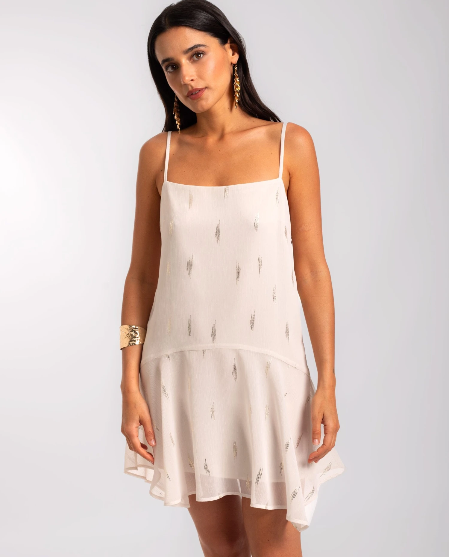 Vestido mini de gasa con escote halter.[readmore]Un vestido que lo tiene todo para destacar en cualquier ocasión. Su tejido de gasa elegante con sutiles toques metálicos de lúrex le da un aire especial, mientras que el escote halter y el corte imperio estilizan la silueta. La lazada ajustable te permite jugar con el escote, llevándola atada al cuello o suelta en forma de lazo. Además, va forrado en gasa para que te sientas cómoda y el corte tipo pañuelo movimiento. Perfecto para combinar con accesorios en plata o dorado y arrasar en cualquier ocasión