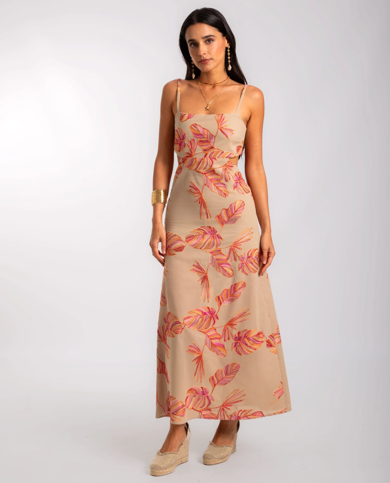 Vestido midi con bordado floral, espalda descubierta y lazada ajustable.[readmore]Este vestido tiene todos los detalles para no pasar desapercibido. El escote palabra de honor recto con tirantes se ajusta al pecho gracias a su diseño entallado. La espalda queda completamente al aire, cerrando con una lazada que puedes regular según cómo te guste llevarlo. El bordado floral en hilo de algodón añade textura al tejido y hace que combine con sandalias o plataformas para cualquier plan de verano con amigas.